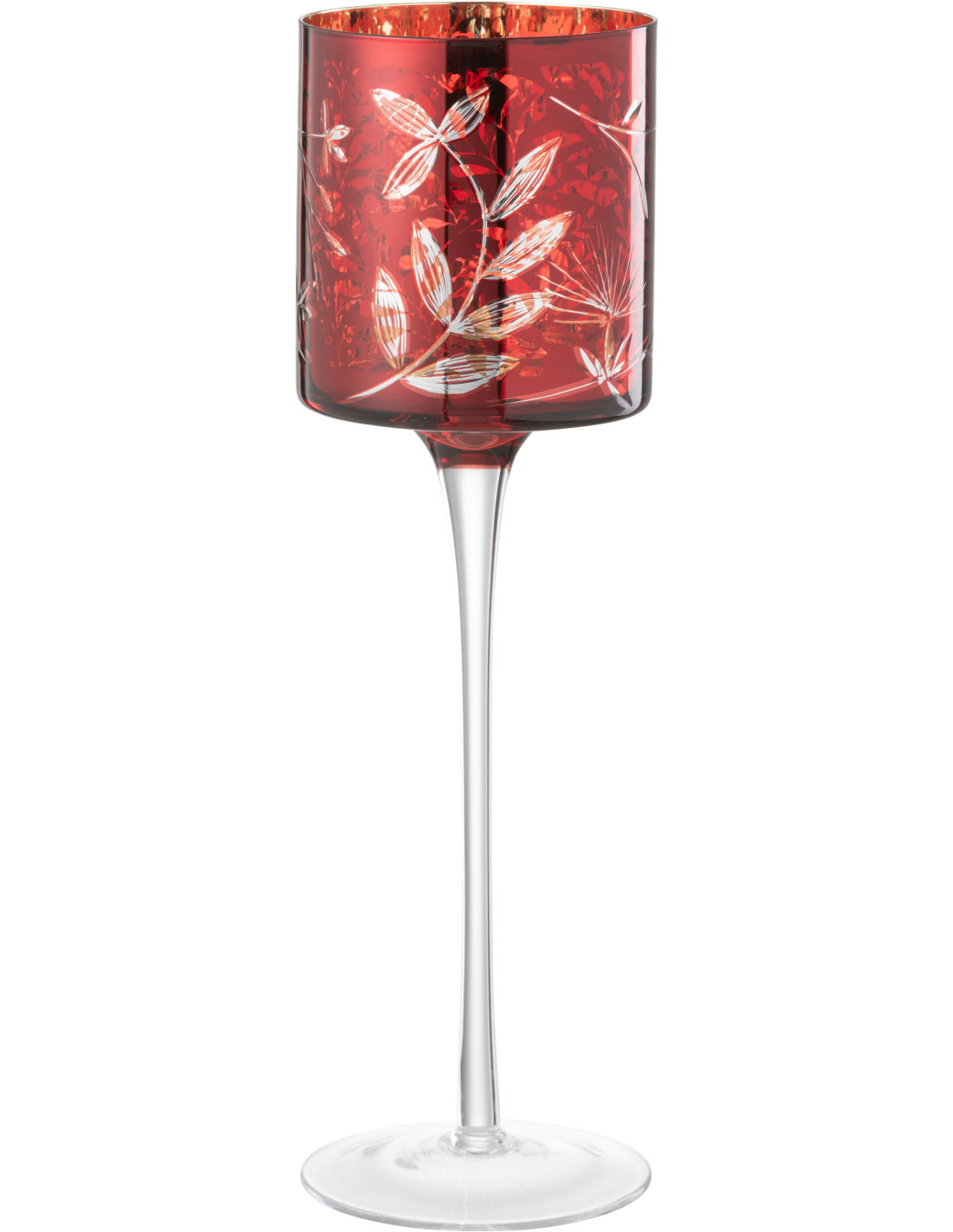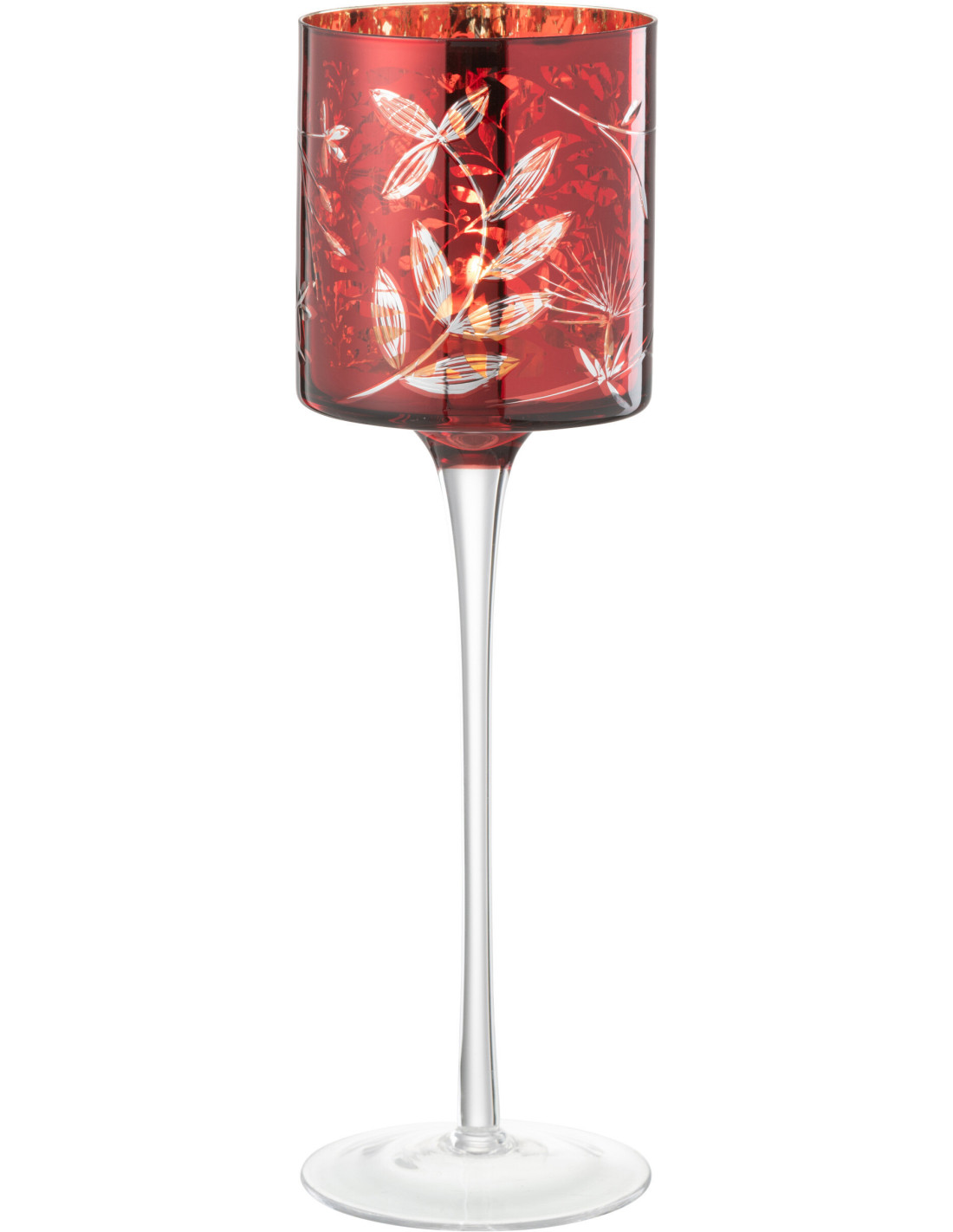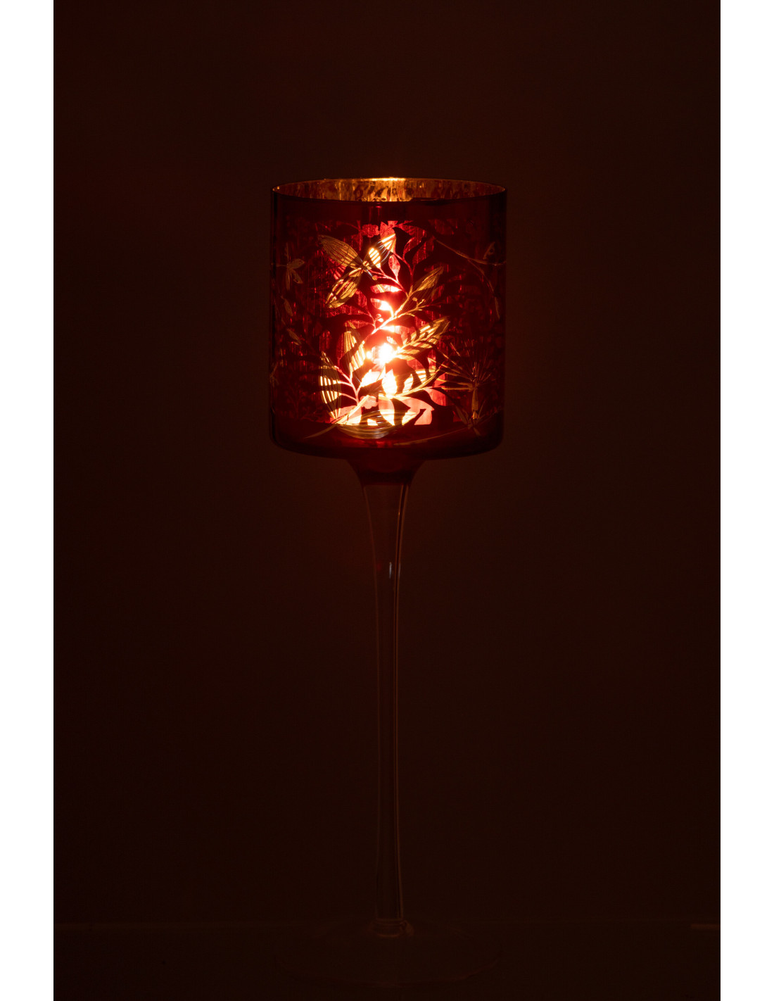 Photophore moderne sur pied XL Hauteur 30 cm en Verre Rouge Motif feuilles Covin