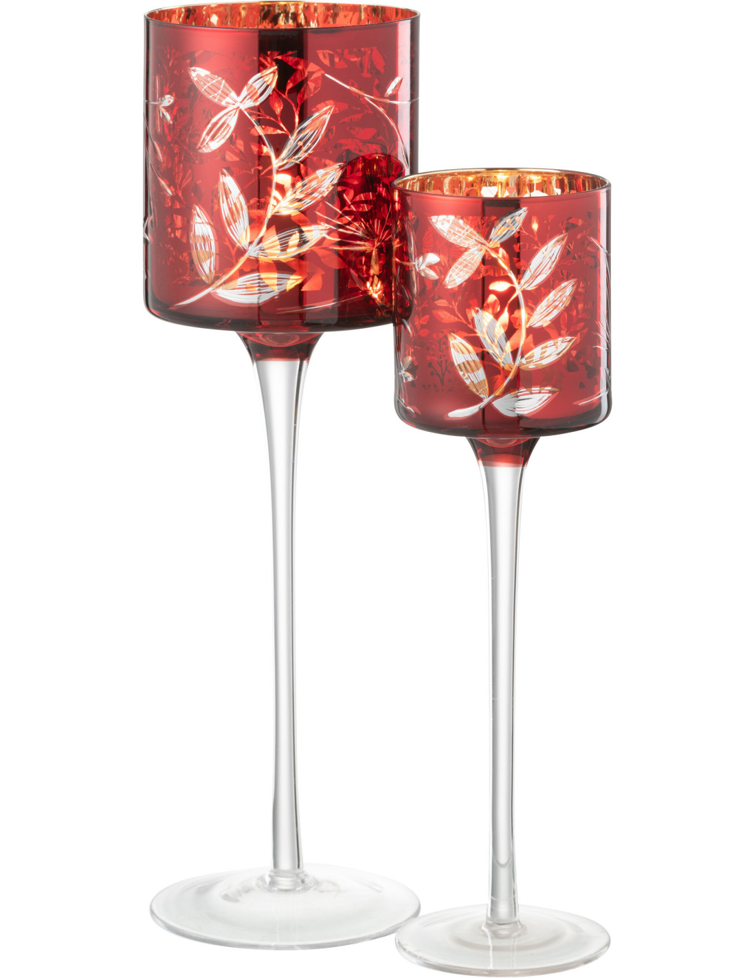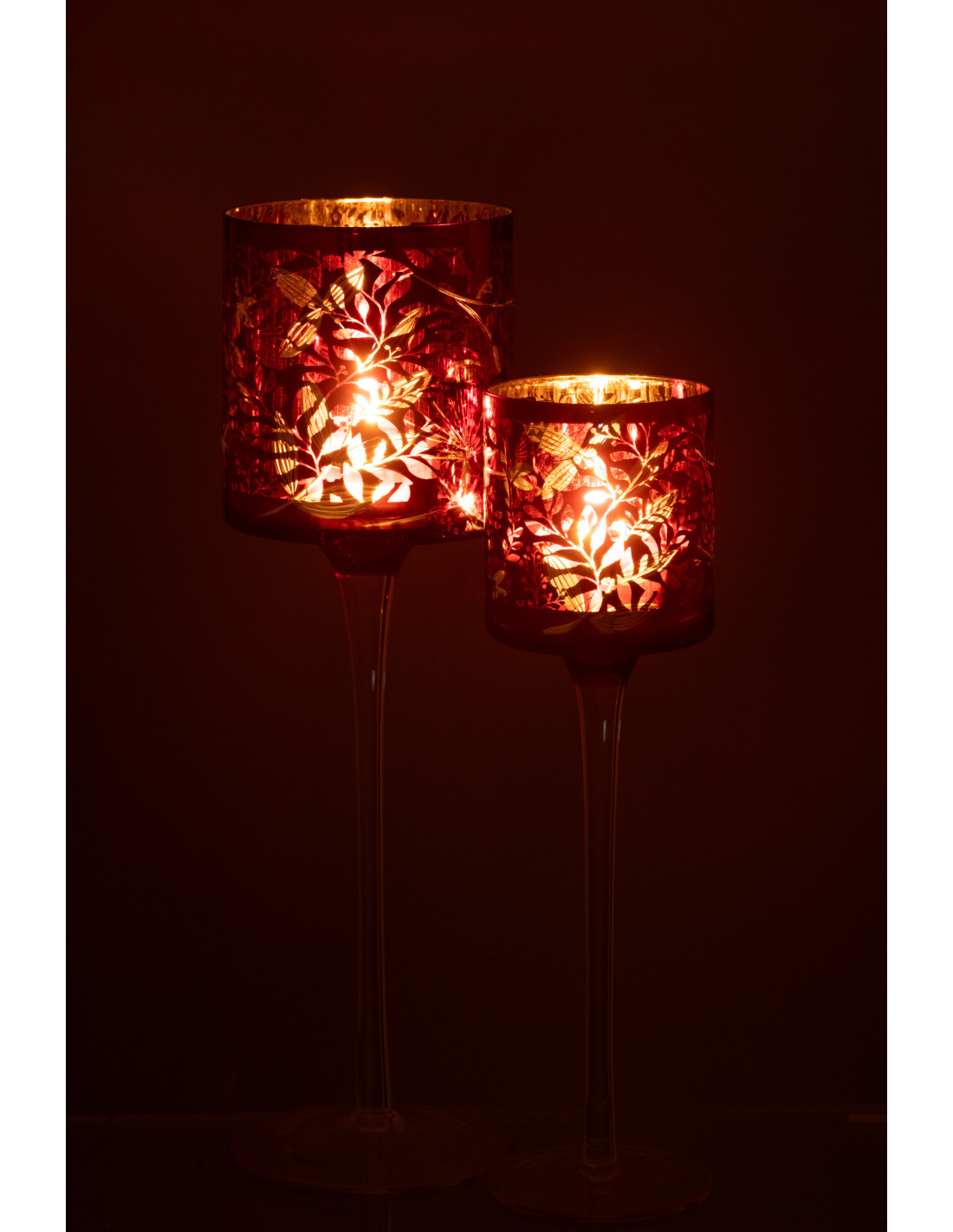 Photophore moderne sur pied XL Hauteur 30 cm en Verre Rouge Motif feuilles Covin - 1