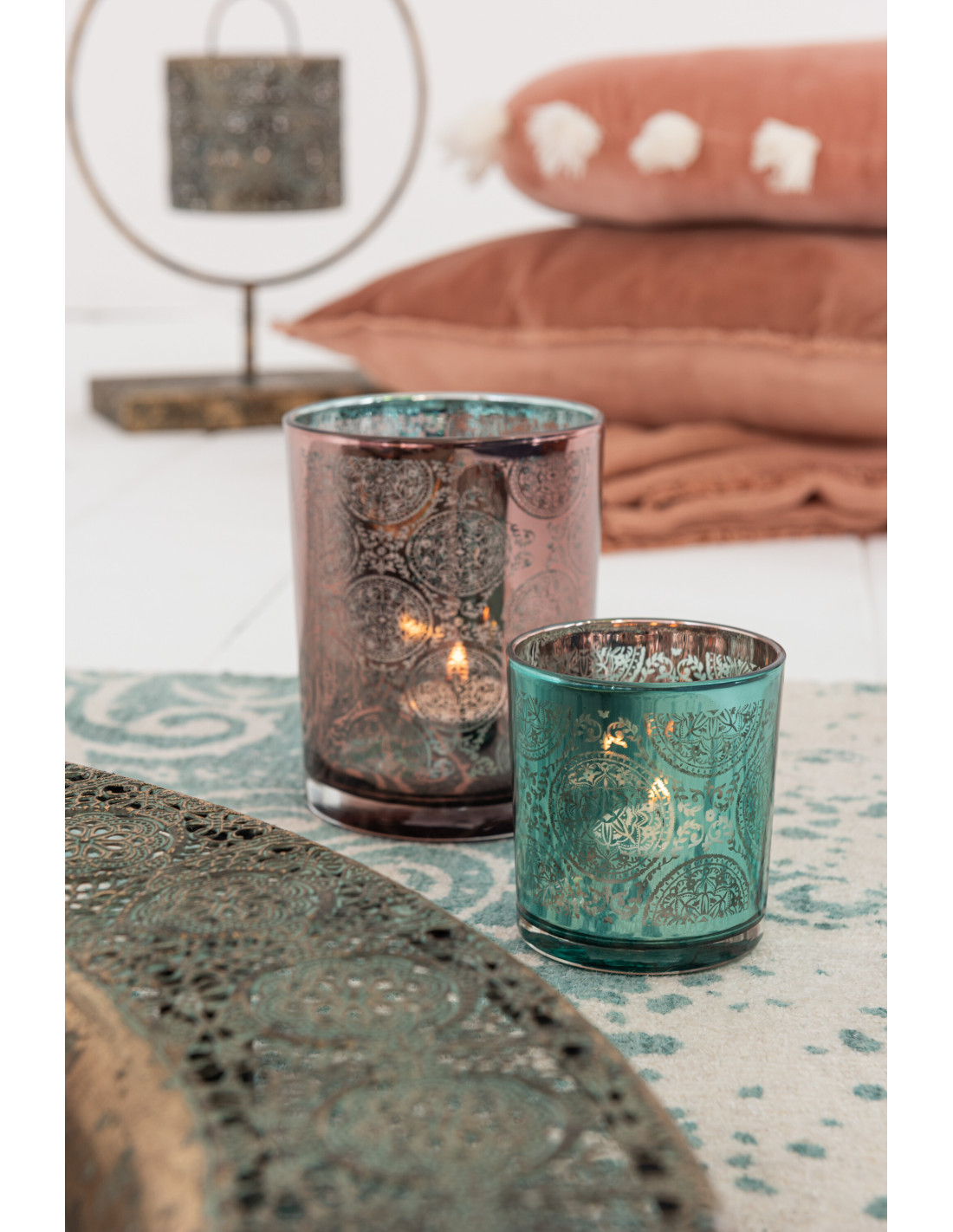 Photophore oriental Diamètre 8 cm en Verre Bleu azur Cuivre Elman (Lot de 2)
