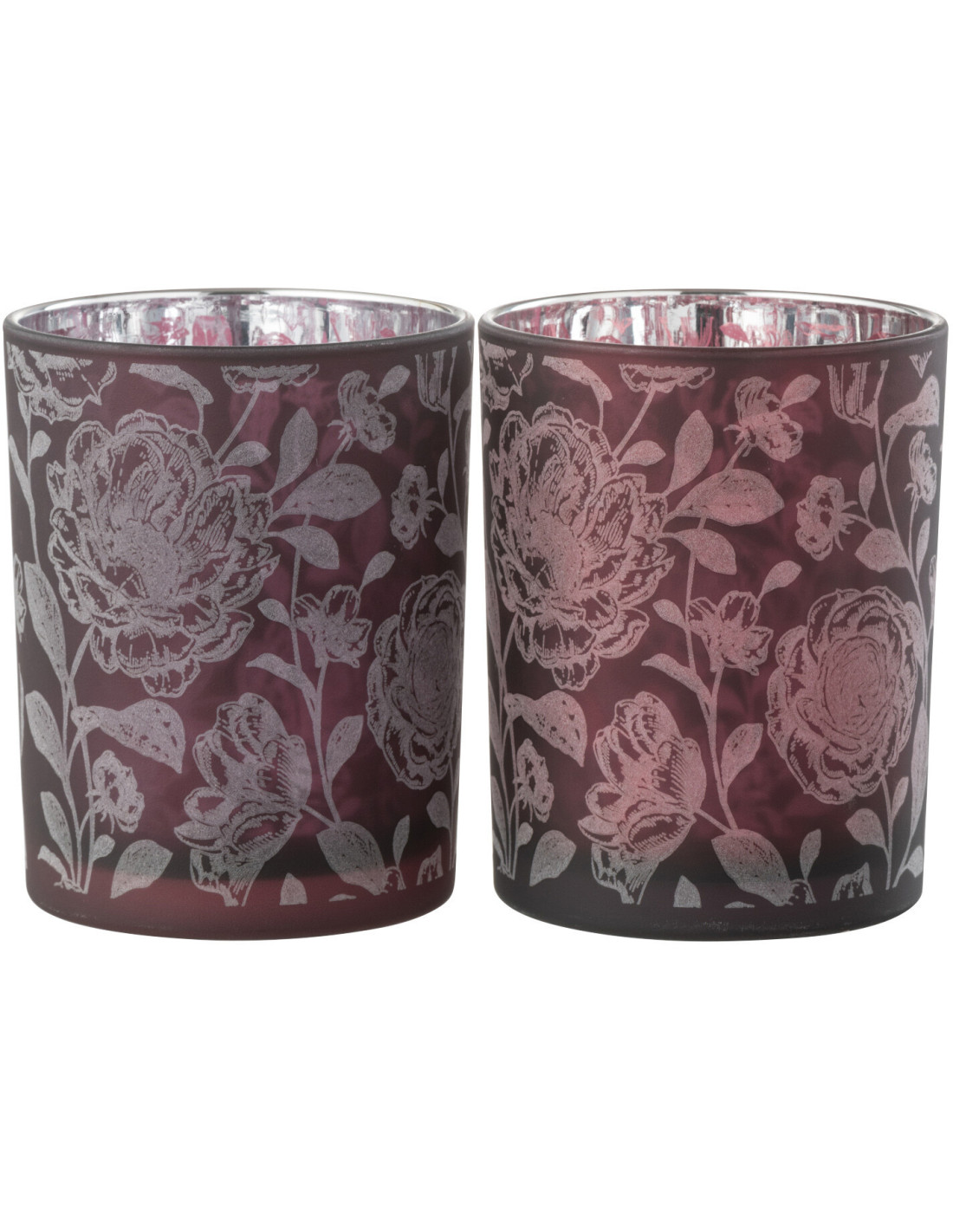Photophore Shabby chic Diamètre 10 cm en Verre Rouge bordeaux Argenté Motif fleurs Urionk (Lot de 2)