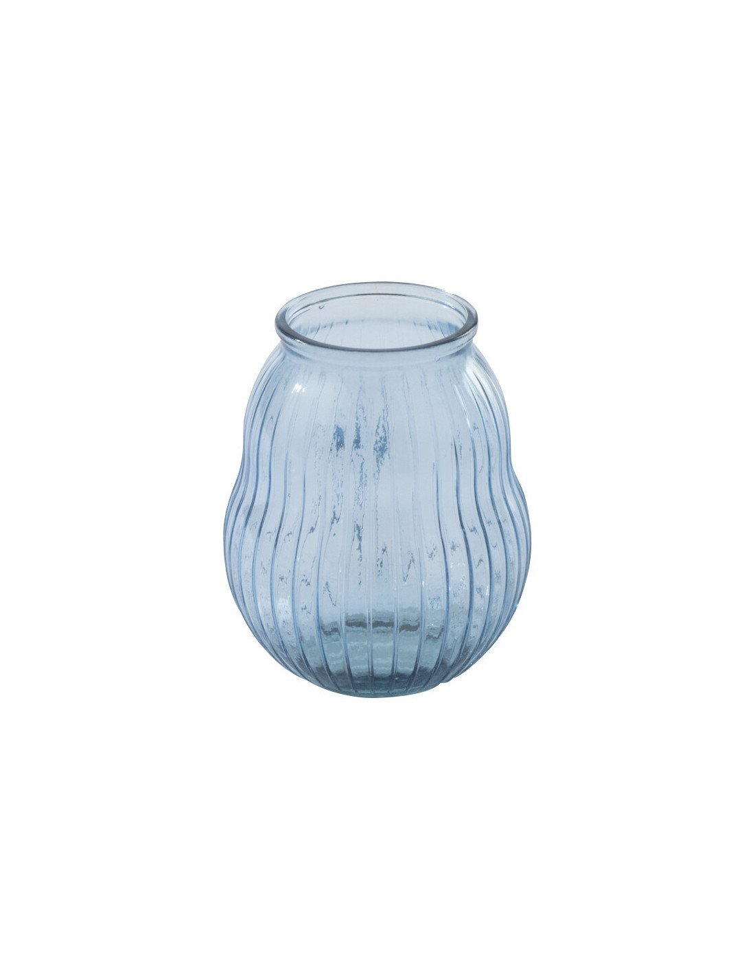 Un photophore au verre bleu clair strié qui diffuse une lumière douce et subtilement texturée.