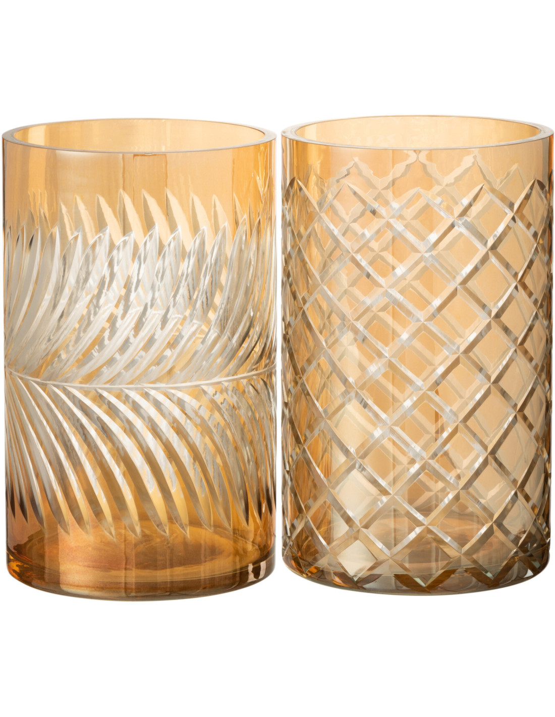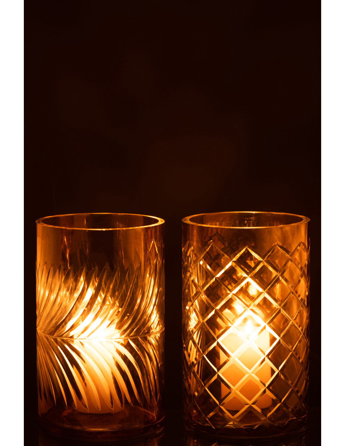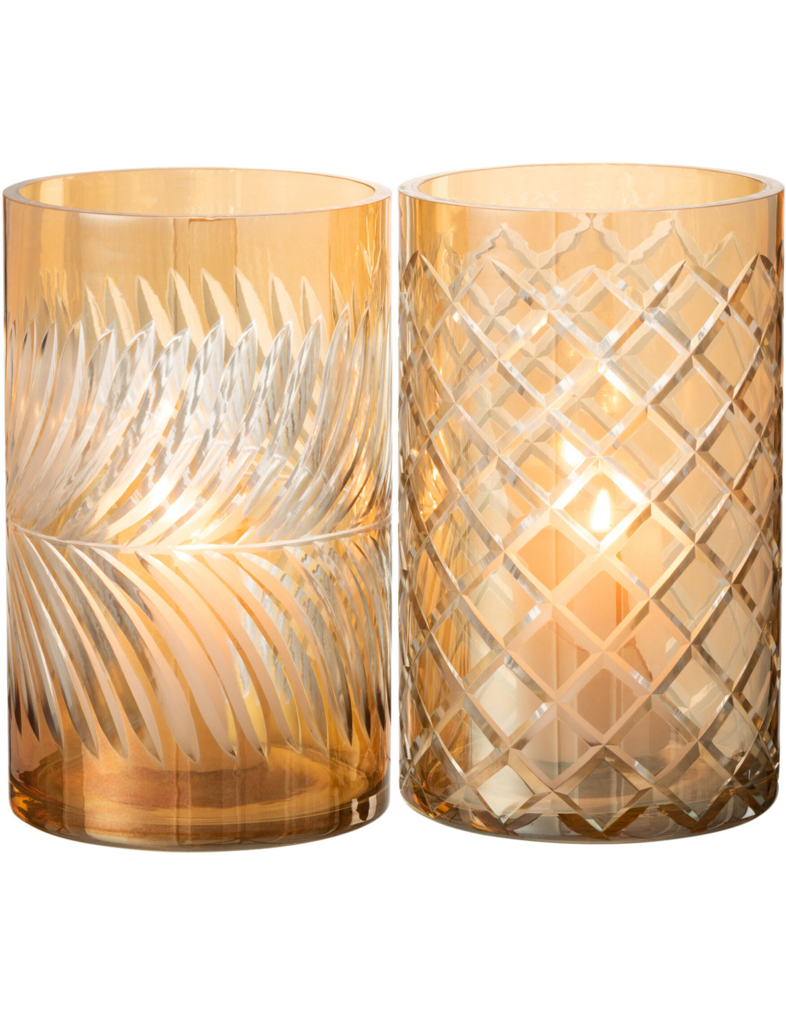 Plus qu'un simple jeu de lumière, une véritable mise en scène. Ce duo de photophores en verre doré au format généreux transforme l'ambiance dès la tombée du jour. Les reliefs captent la flamme et diffusent une lumière vibrante, presque hypnotique.