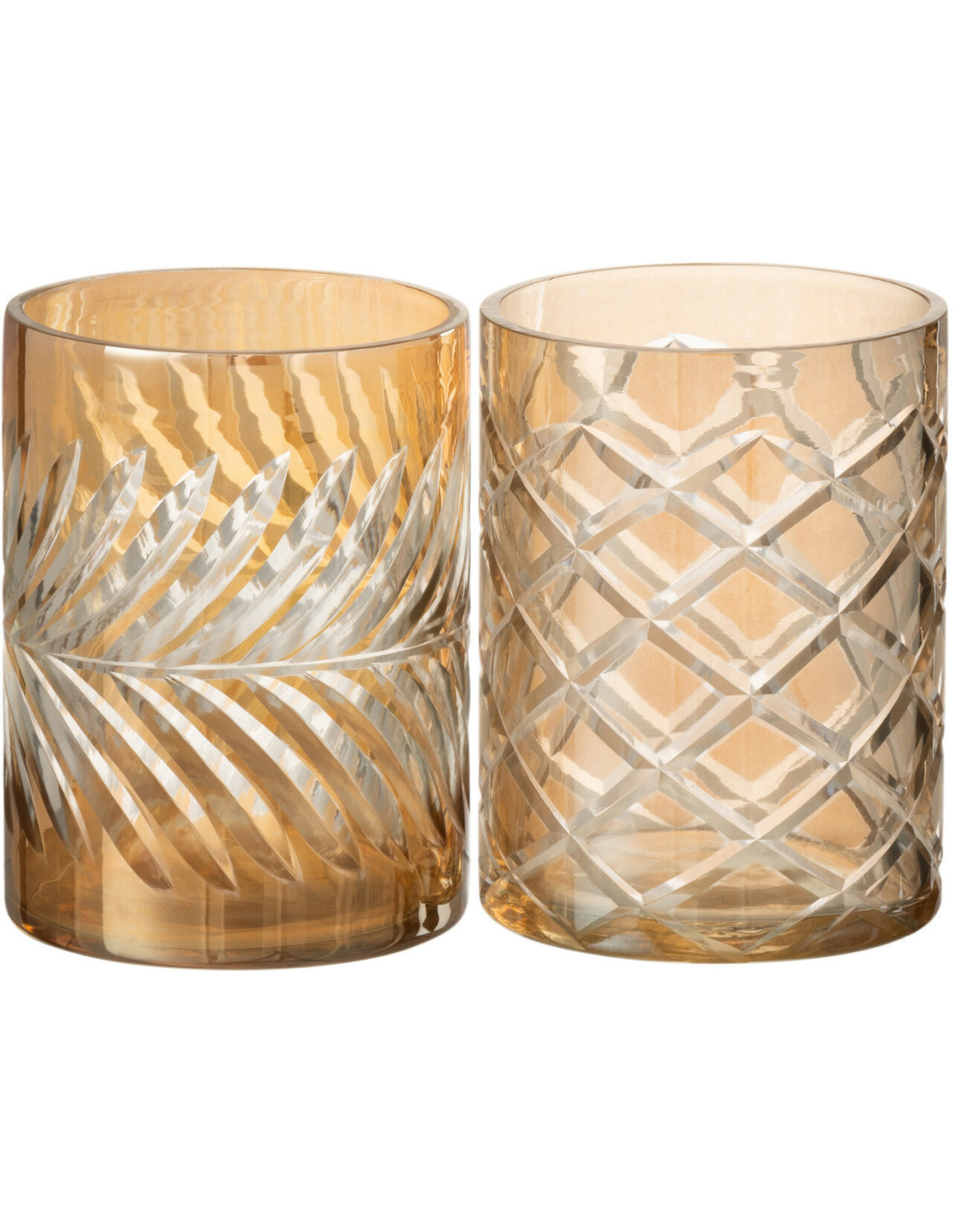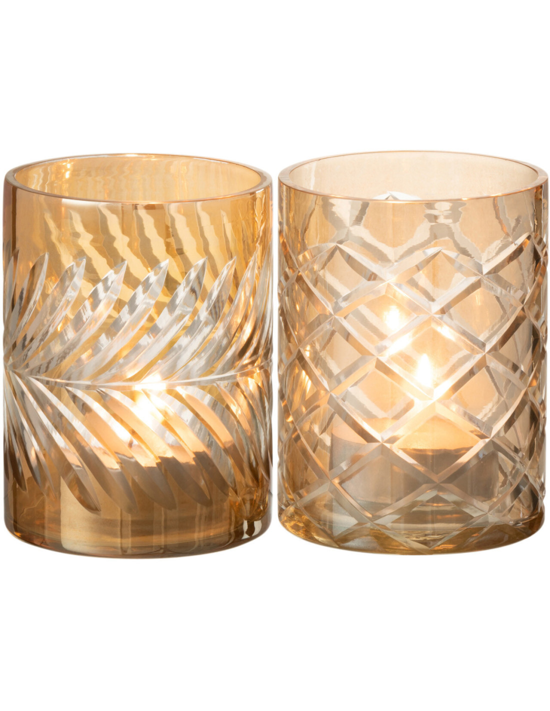 Un équilibre parfait entre présence et subtilité. Ce duo de photophores en verre doré révèle toute la beauté de la lumière à travers ses reliefs délicatement travaillés. Une fois la bougie allumée, l'ambiance devient instantanément plus douce, plus intime.