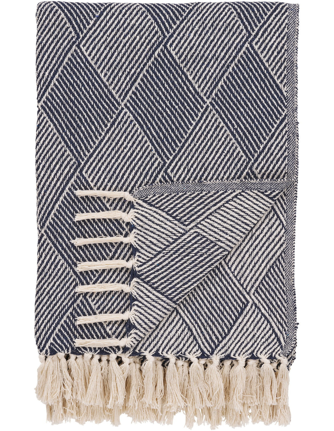 Plaid bohème chic 130x180 Coton Polyester Bleu Beige Avec pompons Motif losanges Izmir
