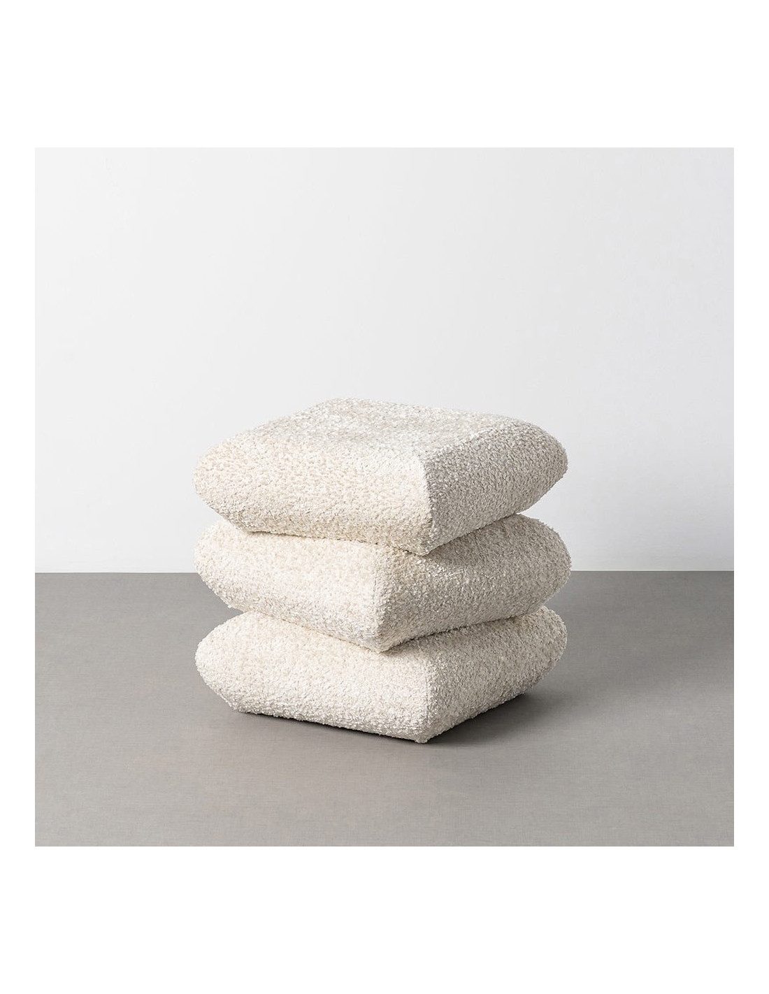 Un pouf qui mise sur la douceur visuelle et le confort. Stacka revisite l’assise avec un design inspiré de coussins superposés, habillé d’un tissu bouclé blanc crème au toucher enveloppant.