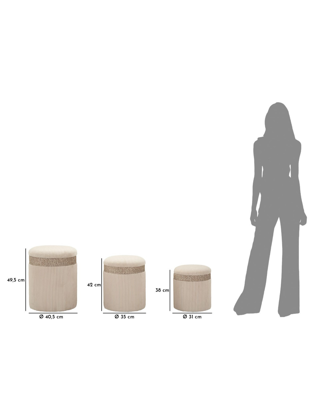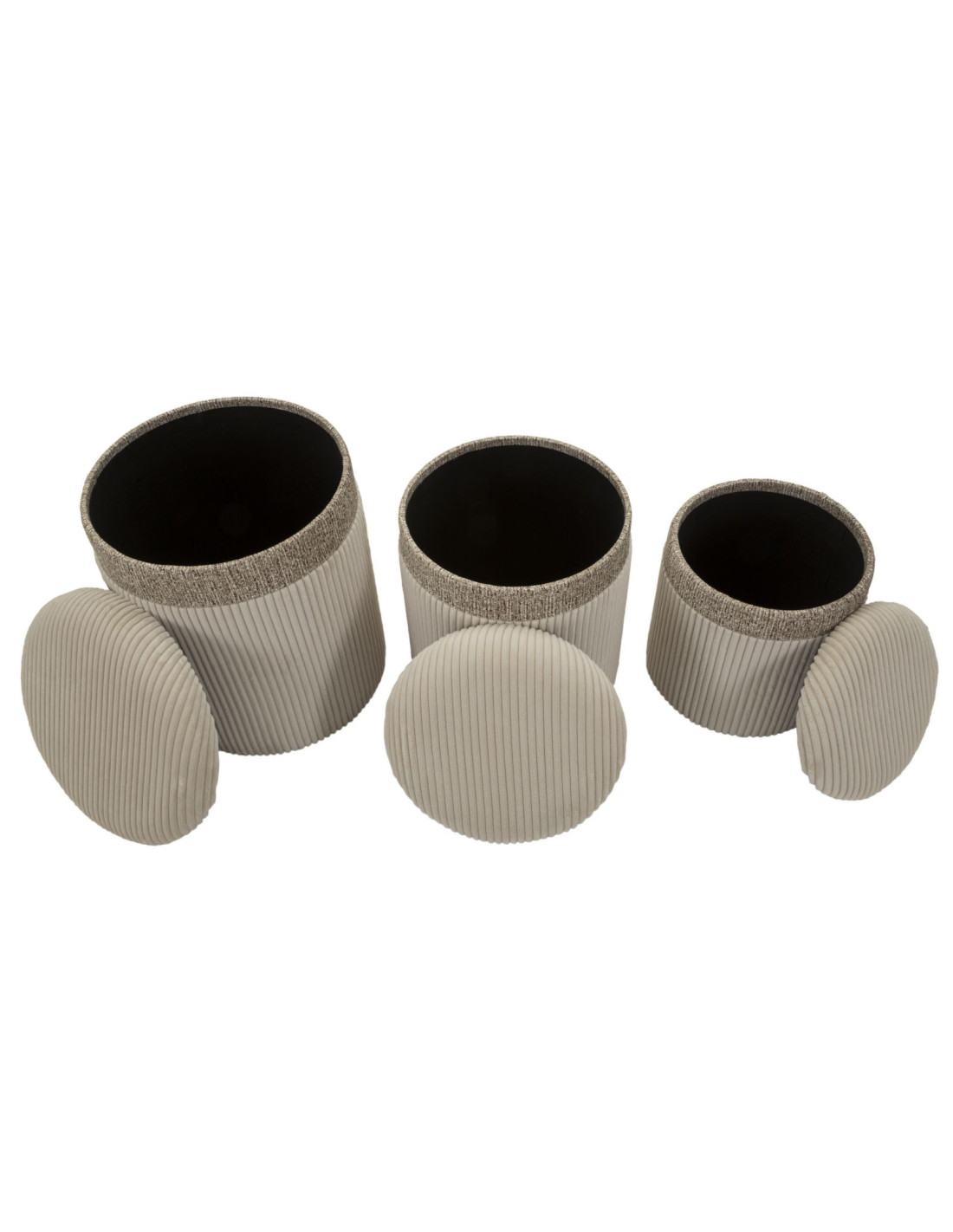 Pouf moderne chic Rond avec coffre de rangement Velours côtelé Blanc crème MDF Cortina (Lot de 3)