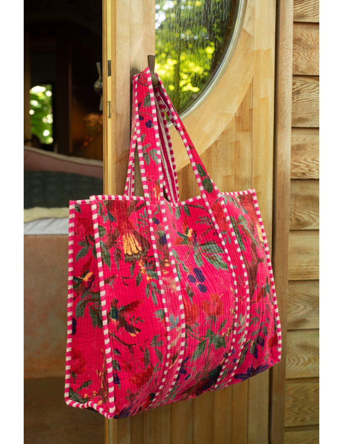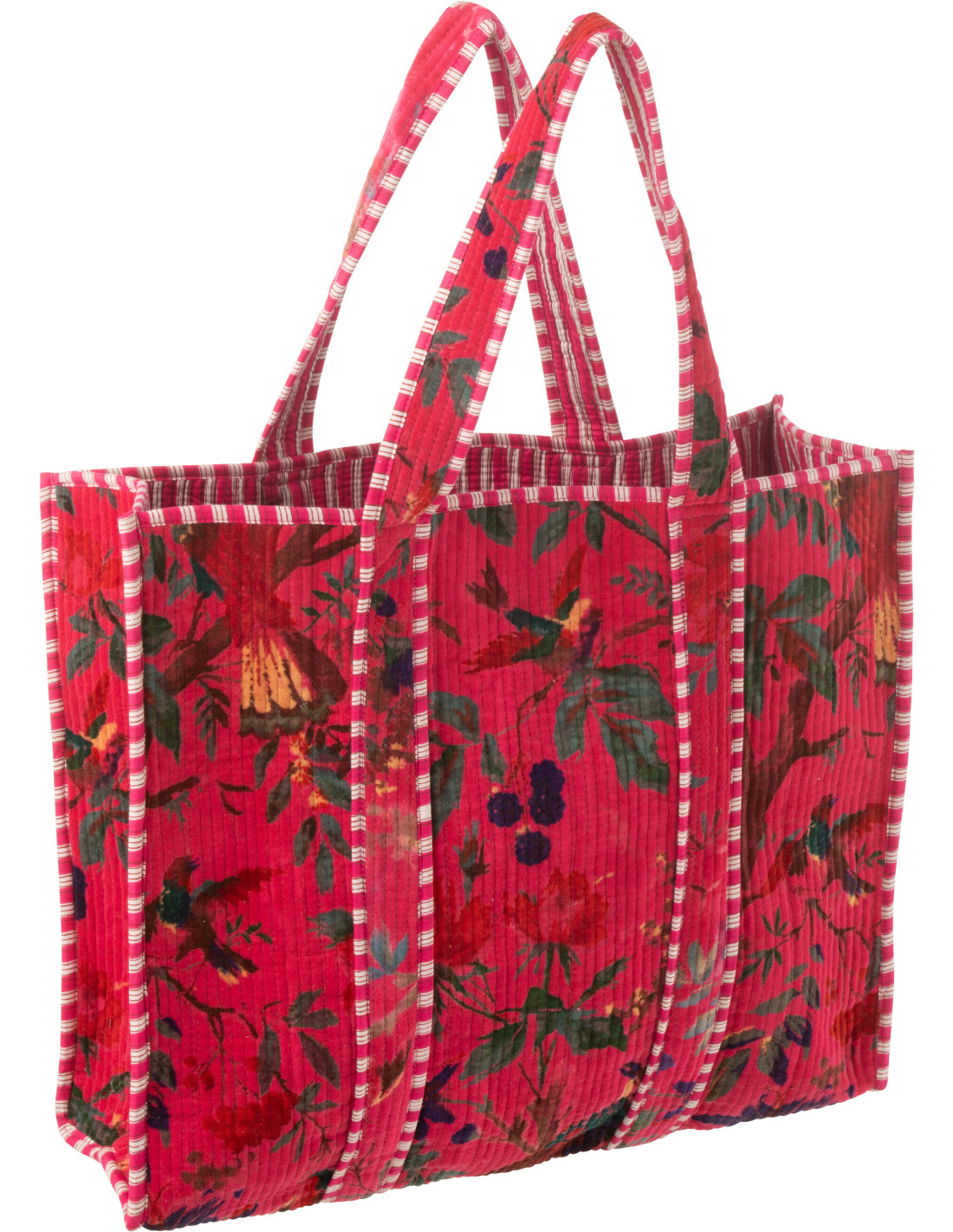 Sac Cabas africain 2 anses 45 cm en Velours de coton Rose Motif oiseaux et fleurs Zyvo