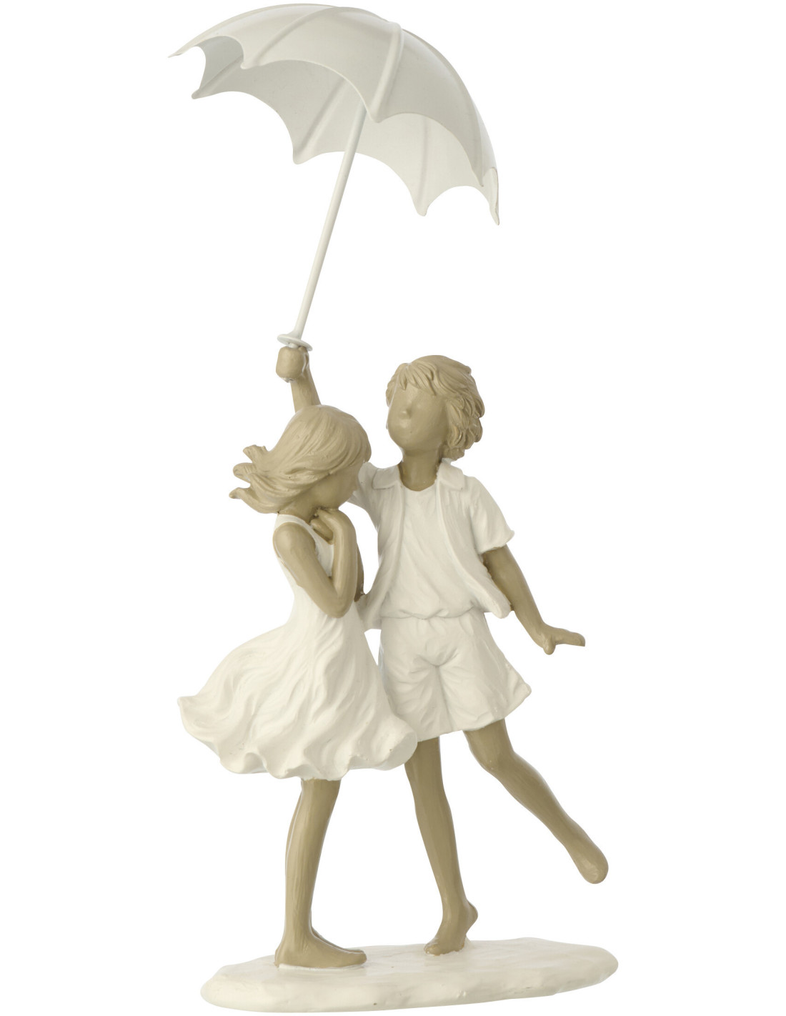 Statuette déco Garçon & Fille Parapluie H 17 cm Résine Vert Beige sable Printania
