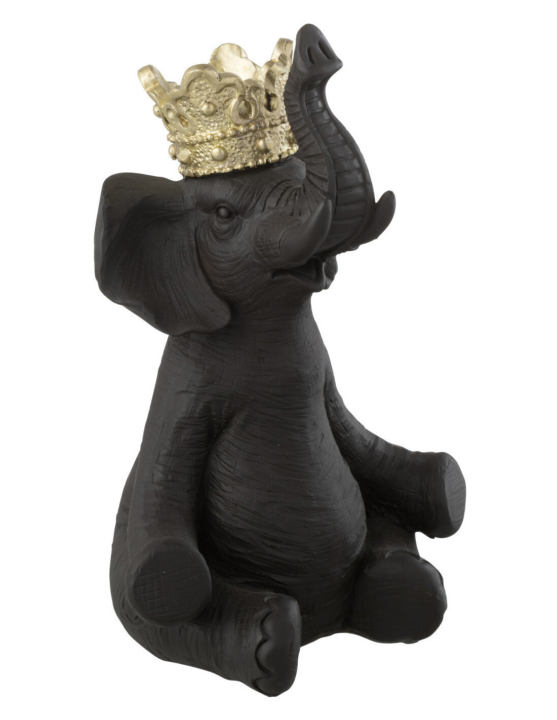 Statuette déco originale Éléphant assis avec couronne Hauteur 19 cm en Résine Noir Doré Ivrena