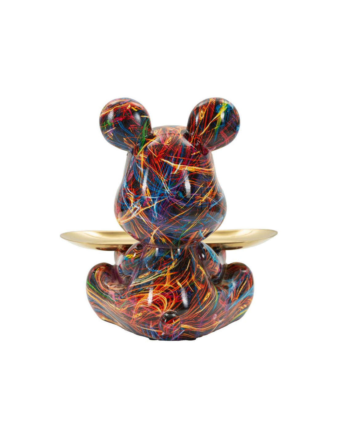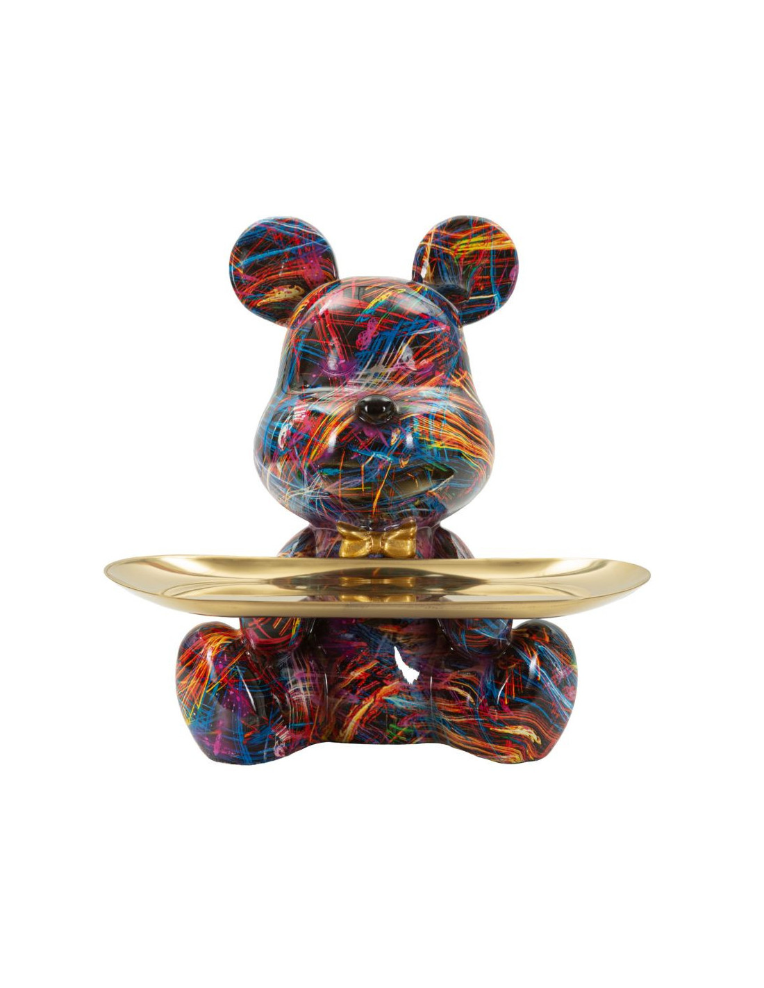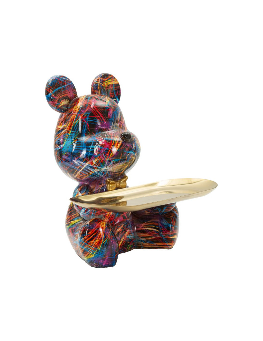 Statuette design Pop Art Ourson A avec plateau Hauteur 22 cm Résine Multicolore Doré Motif lignes Psyco