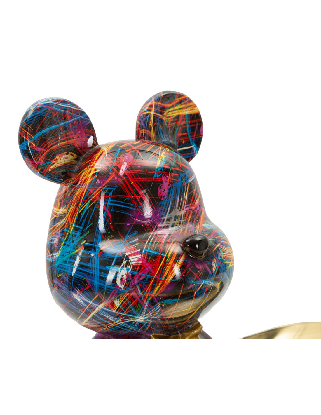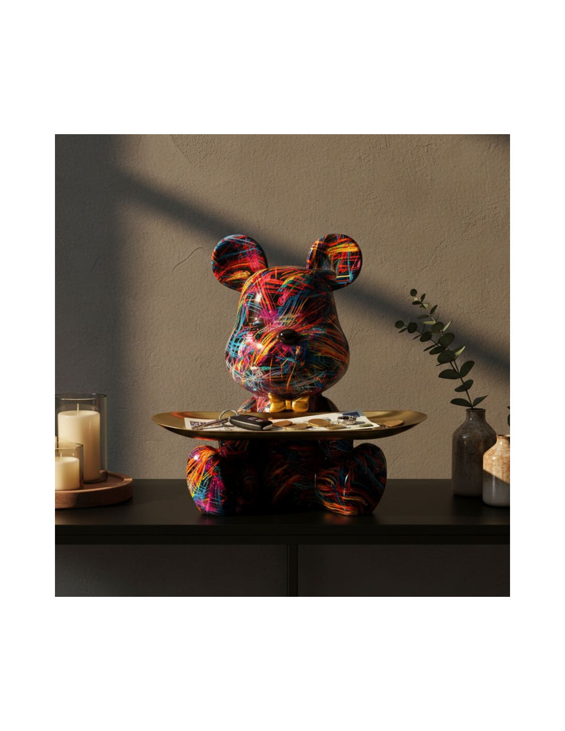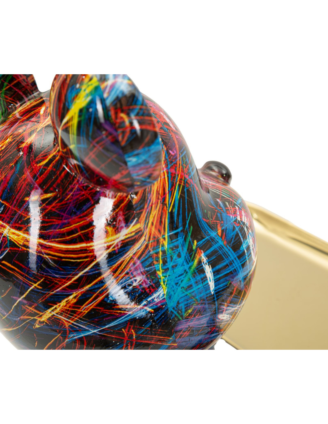 Statuette design Pop Art Ourson A avec plateau Hauteur 22 cm Résine Multicolore Doré Motif lignes Psyco