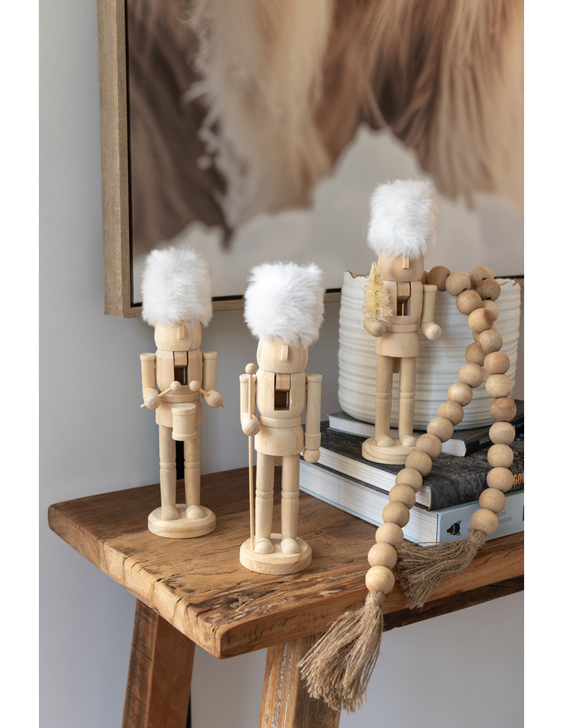 Statuettes déco de Noël Soldats Casse noisette Hauteur 27 cm en Bois Naturel Tissu Blanc Tralinne (Lot de 3)