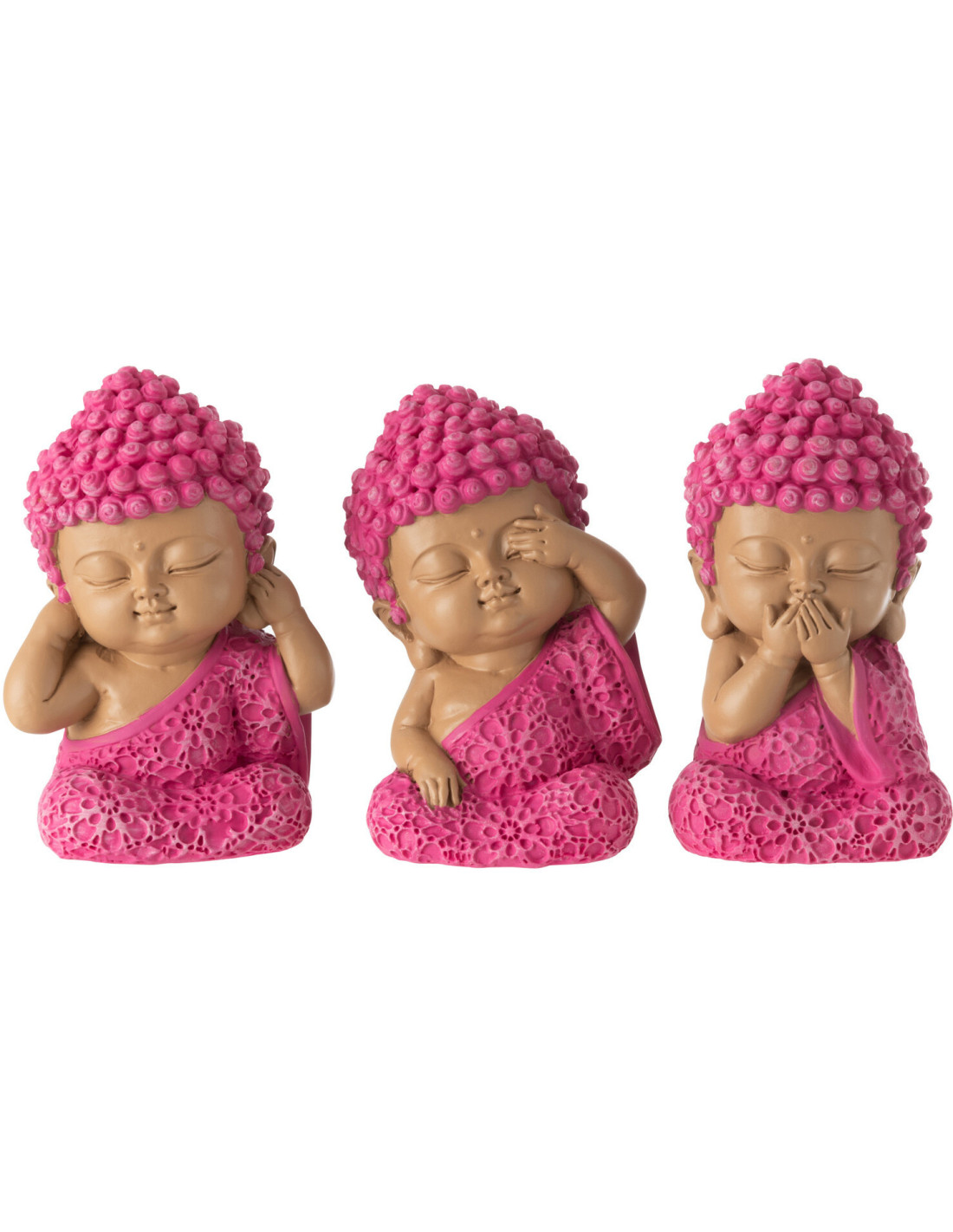 Statuettes déco Moines Entendre Voir Se taire Hauteur 9 cm en Résine Rose fuchsia Bleu azur Tanu (Lot de 3)
