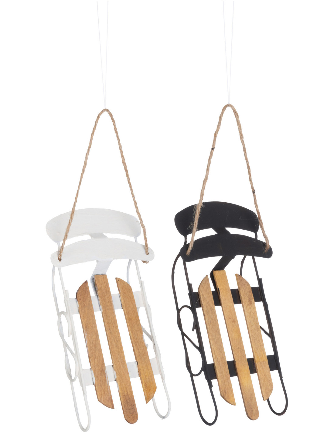 Suspension de Noël Luge Hauteur 15 cm en Métal Blanc Noir Bois Naturel (Lot de 2)