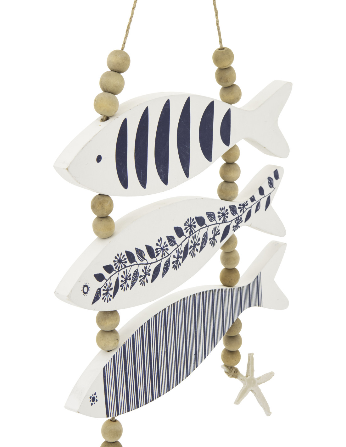 Suspension déco murale 3 Poissons style méditerrannéen Bois MDF Blanc Bleu Corde Perle Aoshira