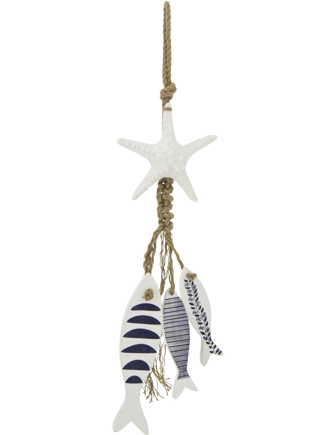 Suspension déco murale Poissons & Étoile de mer style méditerrannéen Bois MDF Blanc Bleu Corde Tressé Aoshira