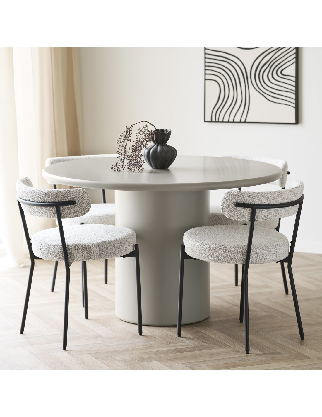 Avec un diamètre de 120 cm, la table offre un espace confortable pour quatre convives. Chacun dispose d’une surface suffisante tout en conservant une proximité agréable, propice aux échanges.