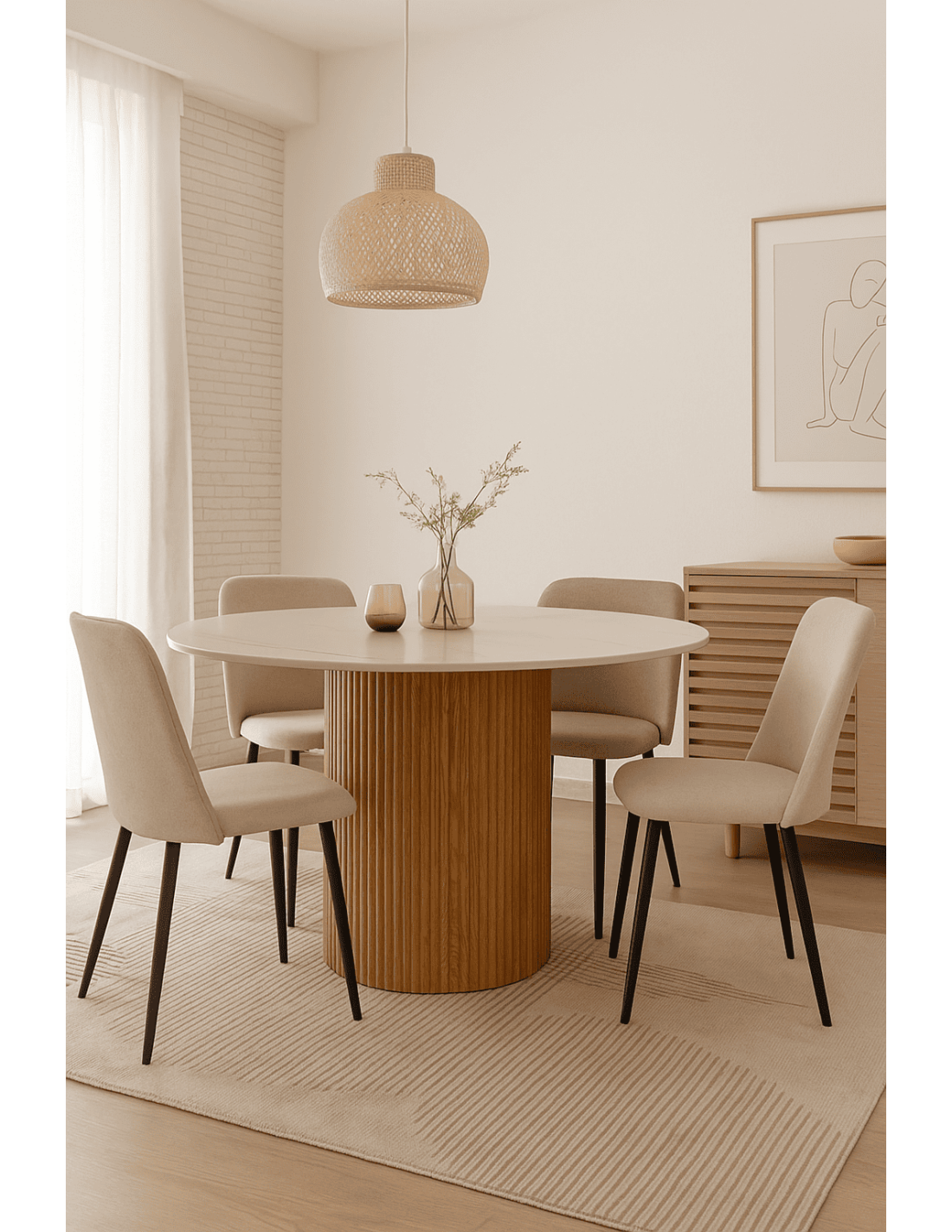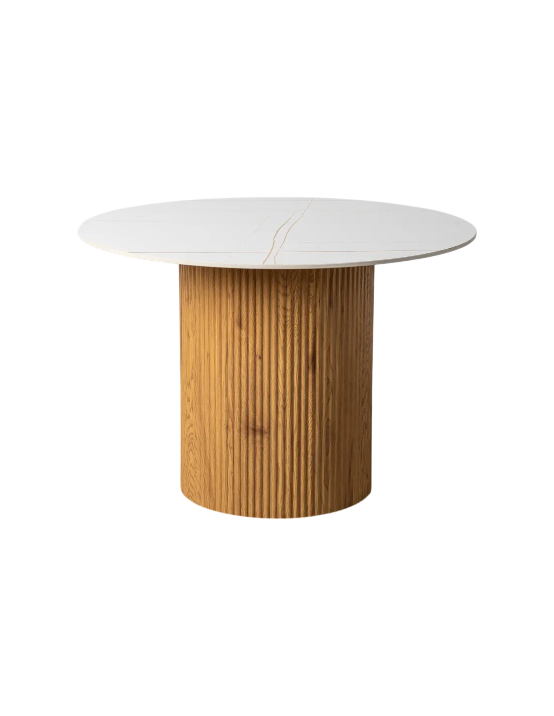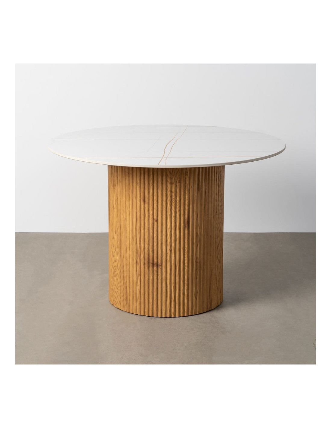 Une table ronde élégante qui associe un plateau en pierre frittée blanc naturel à un pied cylindrique texturé pour une présence chaleureuse.