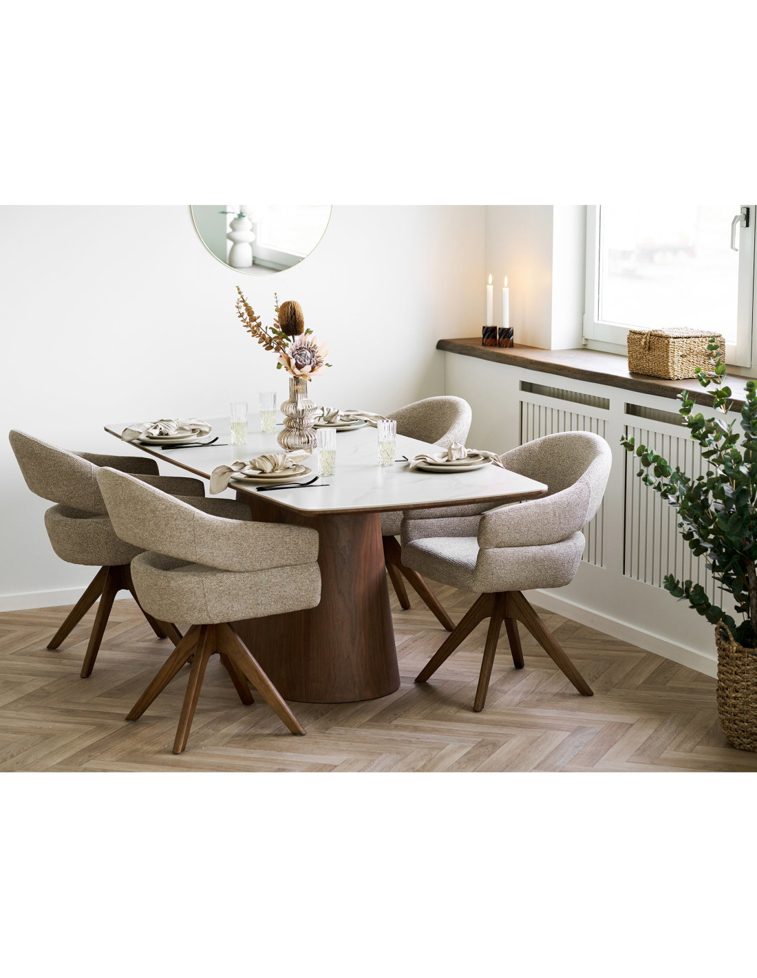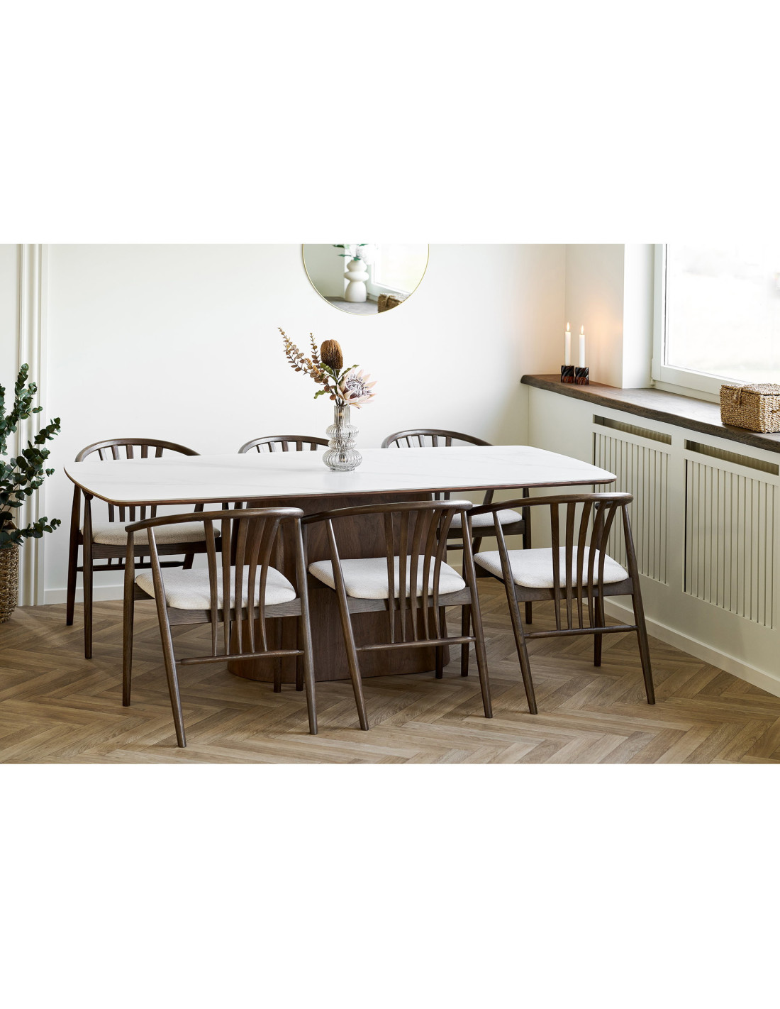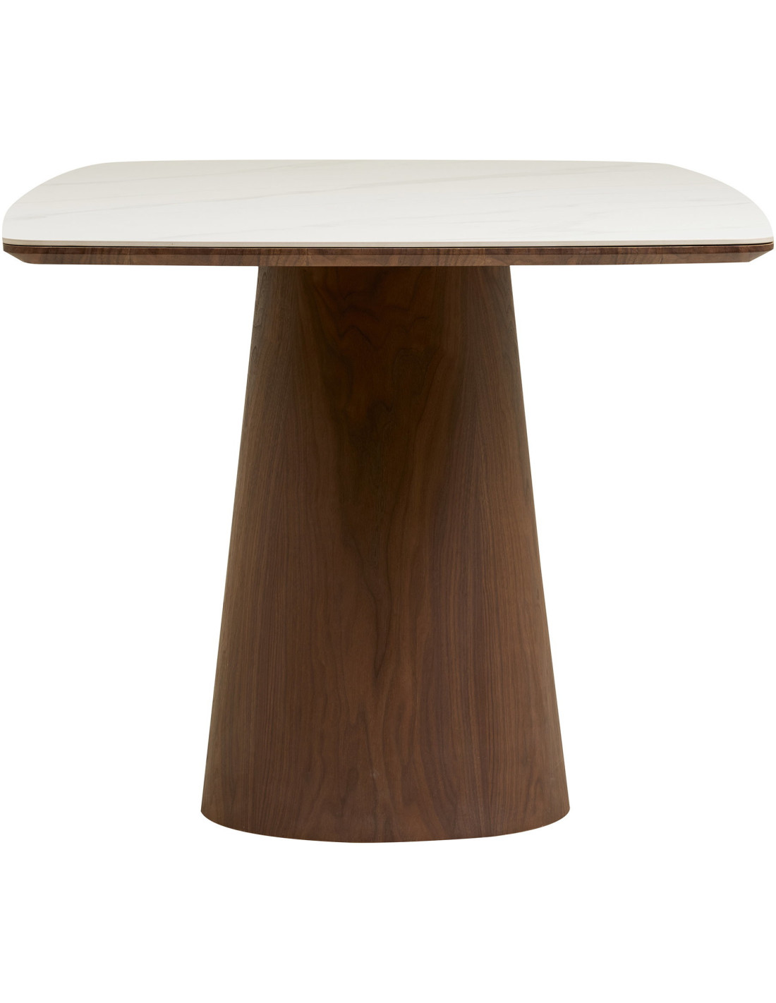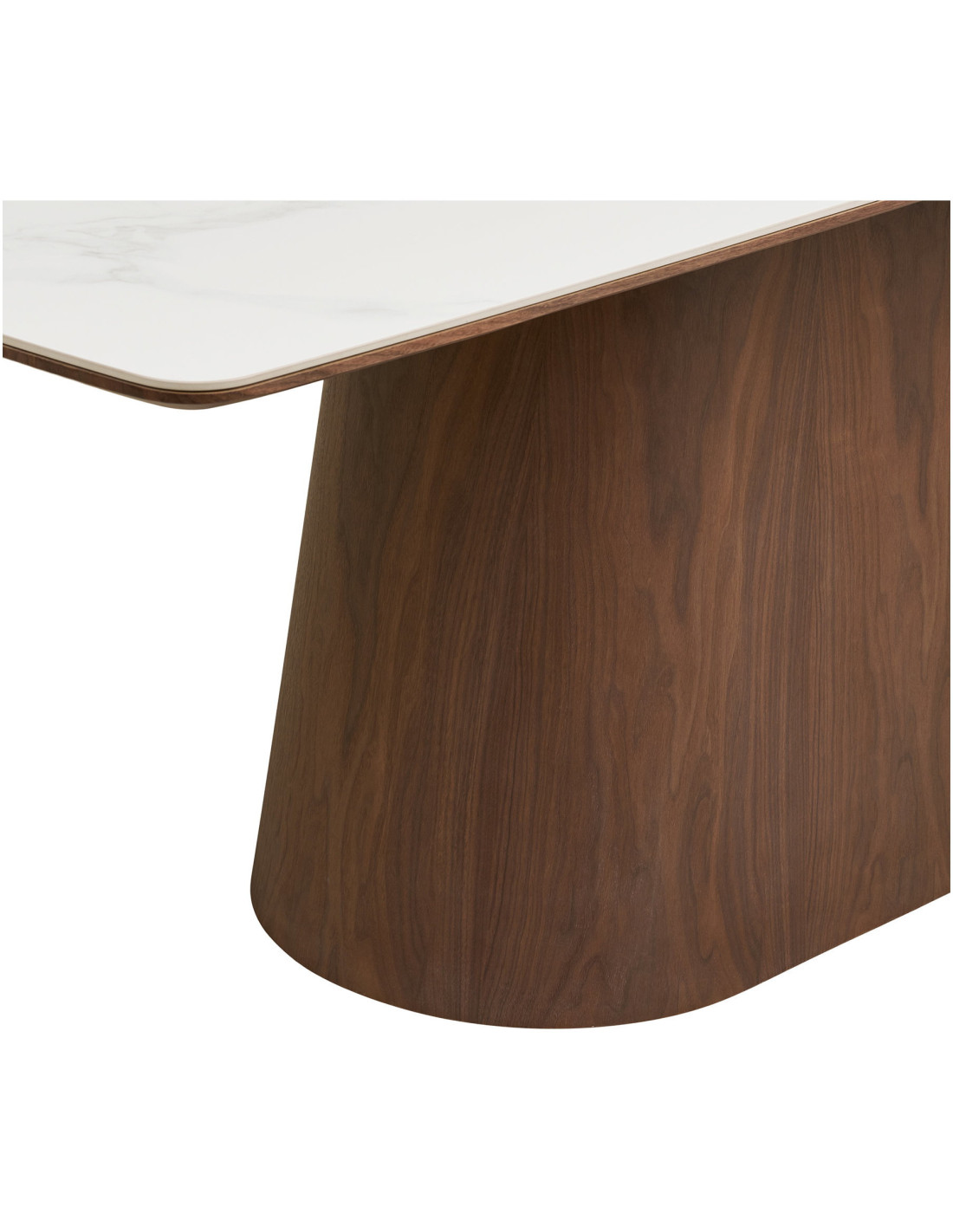 Le pied central en bois foncé joue un rôle essentiel dans l’équilibre de cette table. Sa forme pleine et légèrement évasée apporte une stabilité visuelle forte. Il contraste avec la légèreté du plateau pour créer une composition harmonieuse. Le veinage du bois ajoute une dimension naturelle et chaleureuse. Il ancre la table dans l’espace avec justesse. Il apporte du relief à l’ensemble. Il structure sans rigidité. Il renforce l’identité du produit. Il accompagne les lignes du plateau. Il offre une lecture claire du design. Il contribue à une esthétique cohérente et durable.