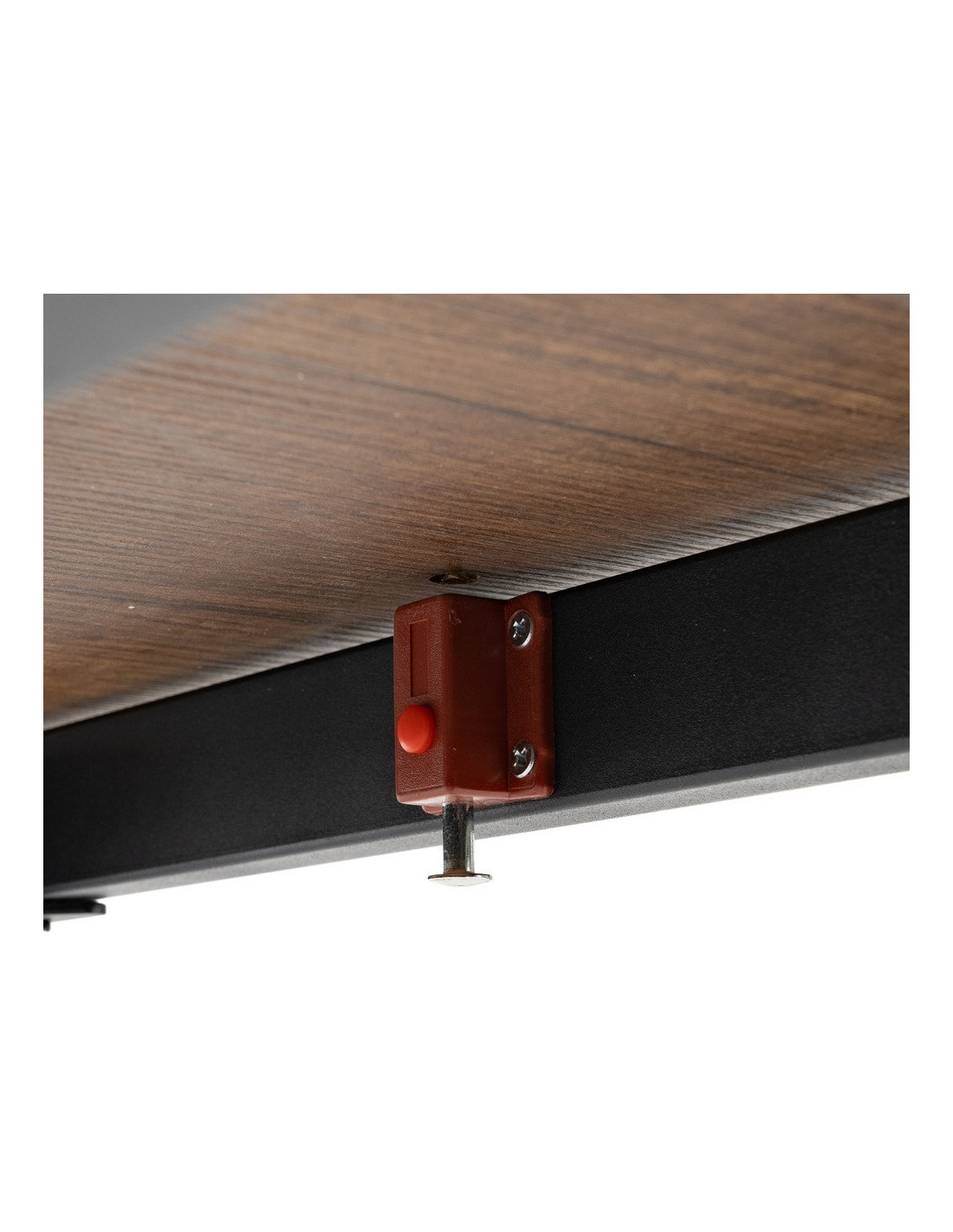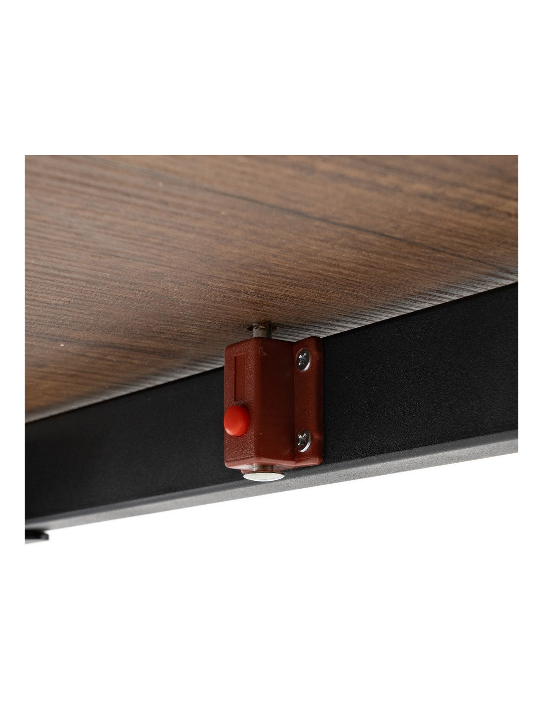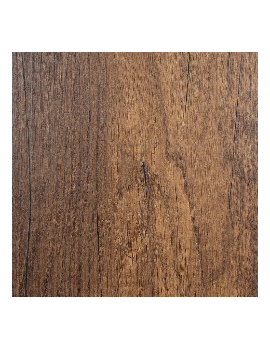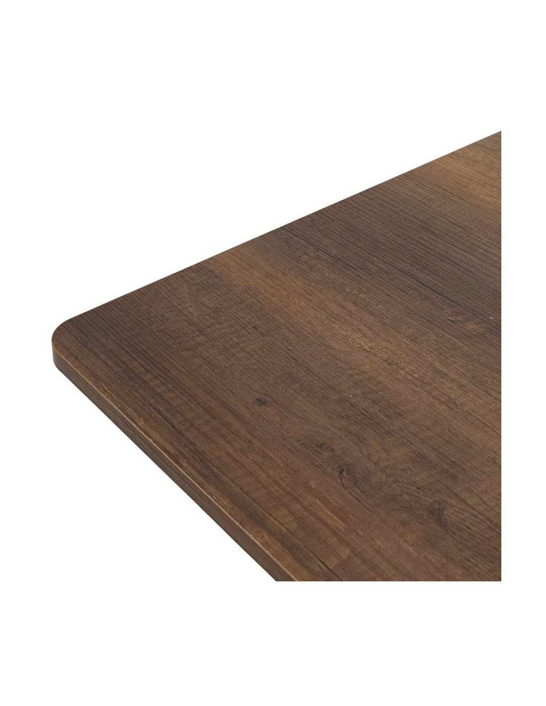 Le plateau présente un décor bois marron avec un veinage visible. Cette teinte apporte une atmosphère plus enveloppante et contraste avec la structure sombre.