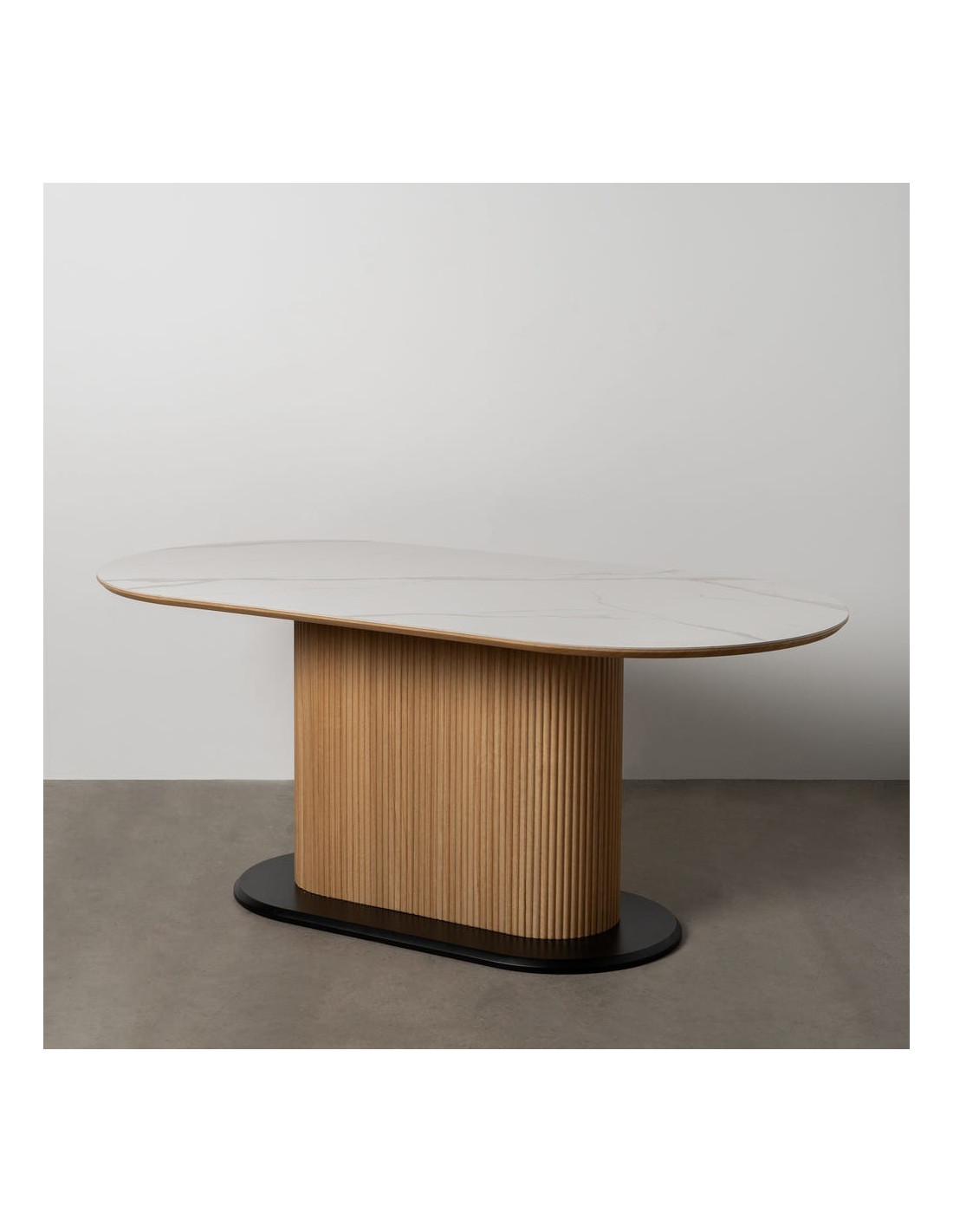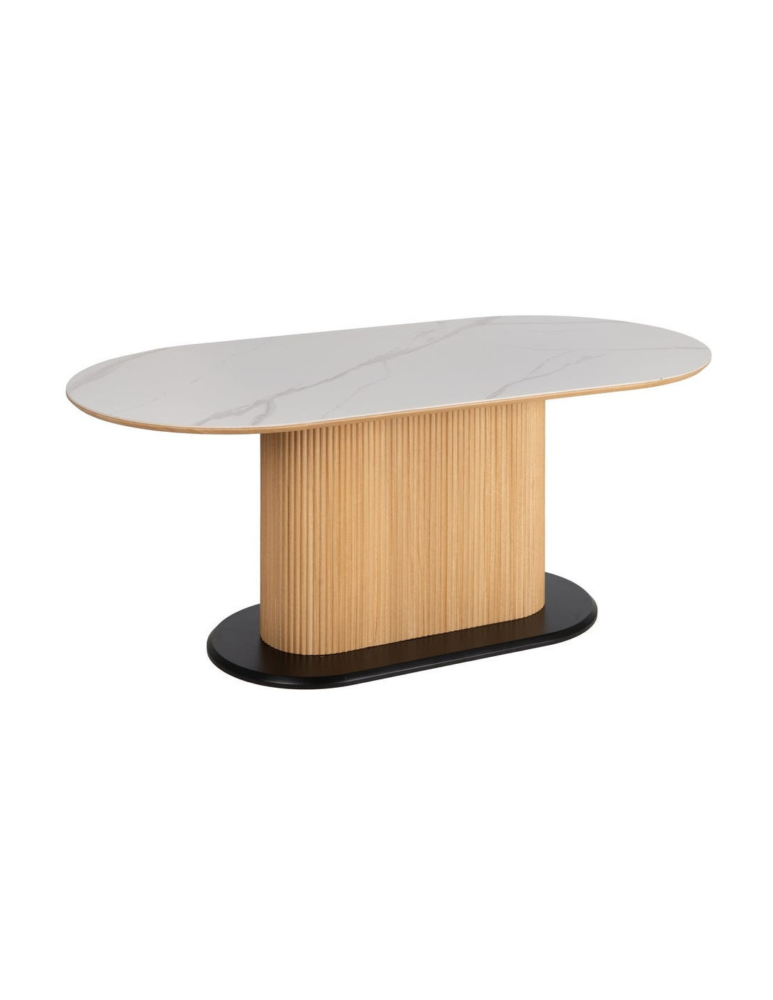 Une table ovale au design travaillé, combinant un plateau en céramique effet marbre blanc avec un pied central rainuré posé sur une base noire contrastante.