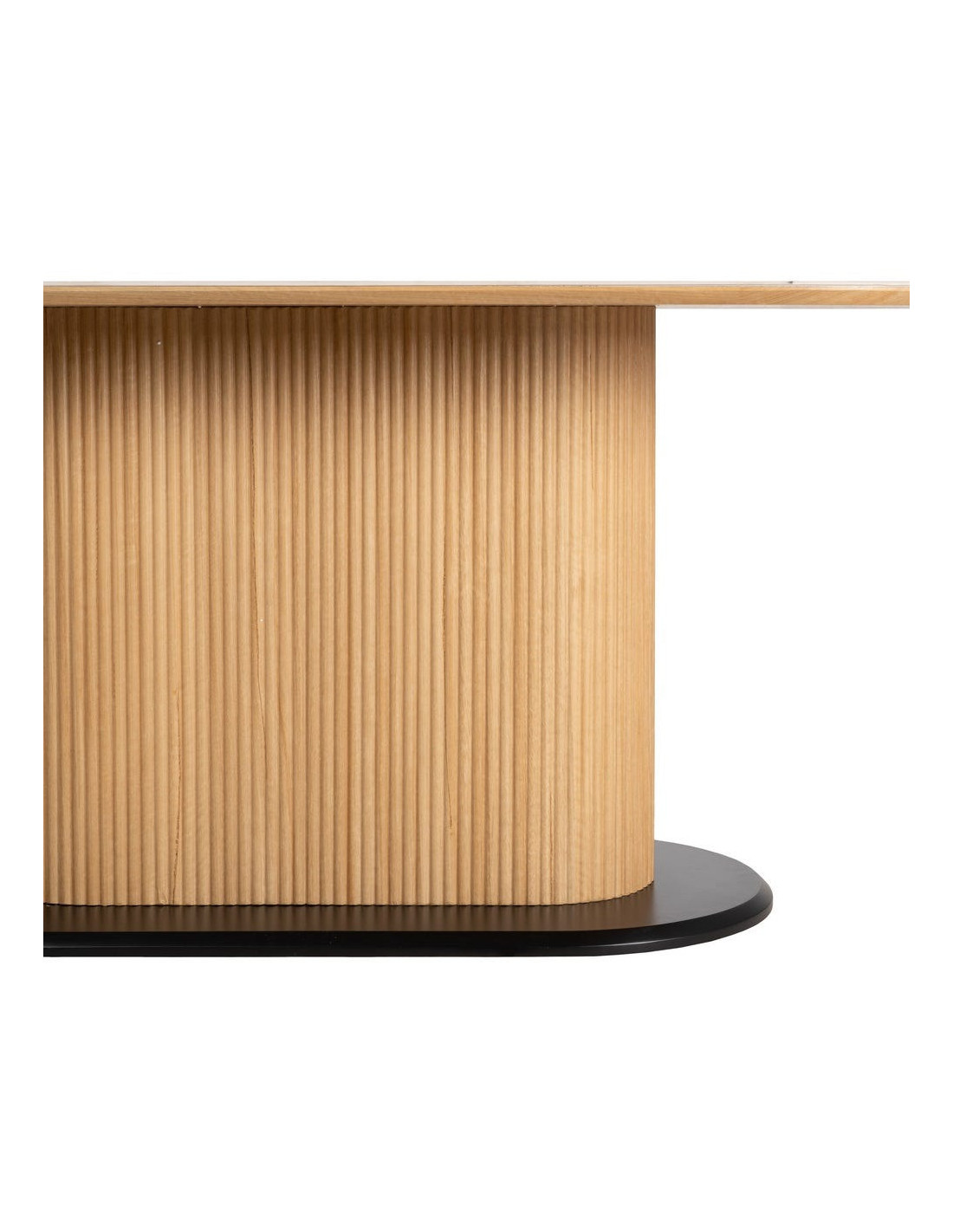 Le piètement en MDF se distingue par son effet rainuré vertical, apportant du rythme et du relief. Il structure visuellement la table tout en conservant une belle légèreté.