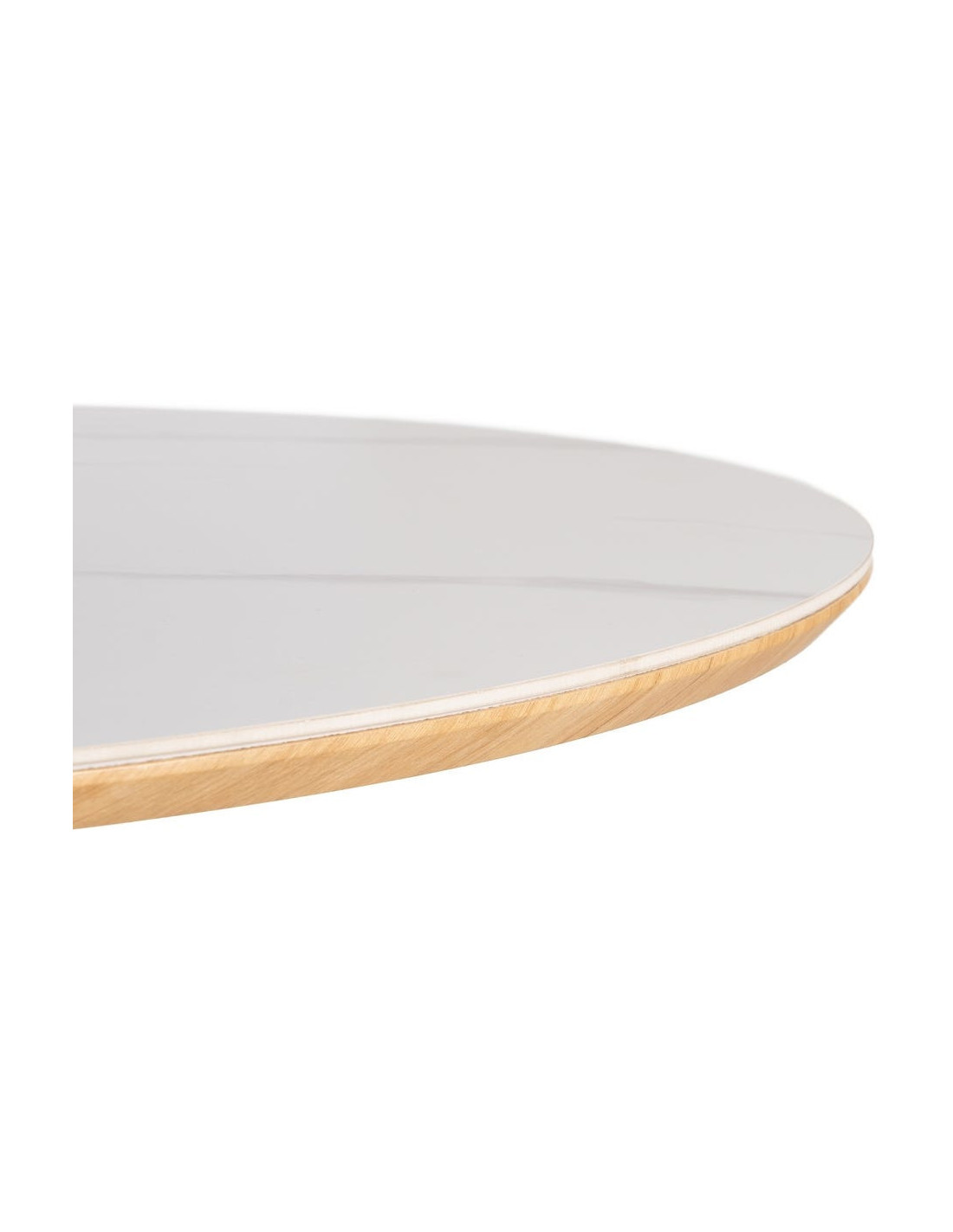 La céramique effet marbre reproduit l’esthétique de la pierre naturelle. Le MDF permet la création d’un piètement structuré et stable.