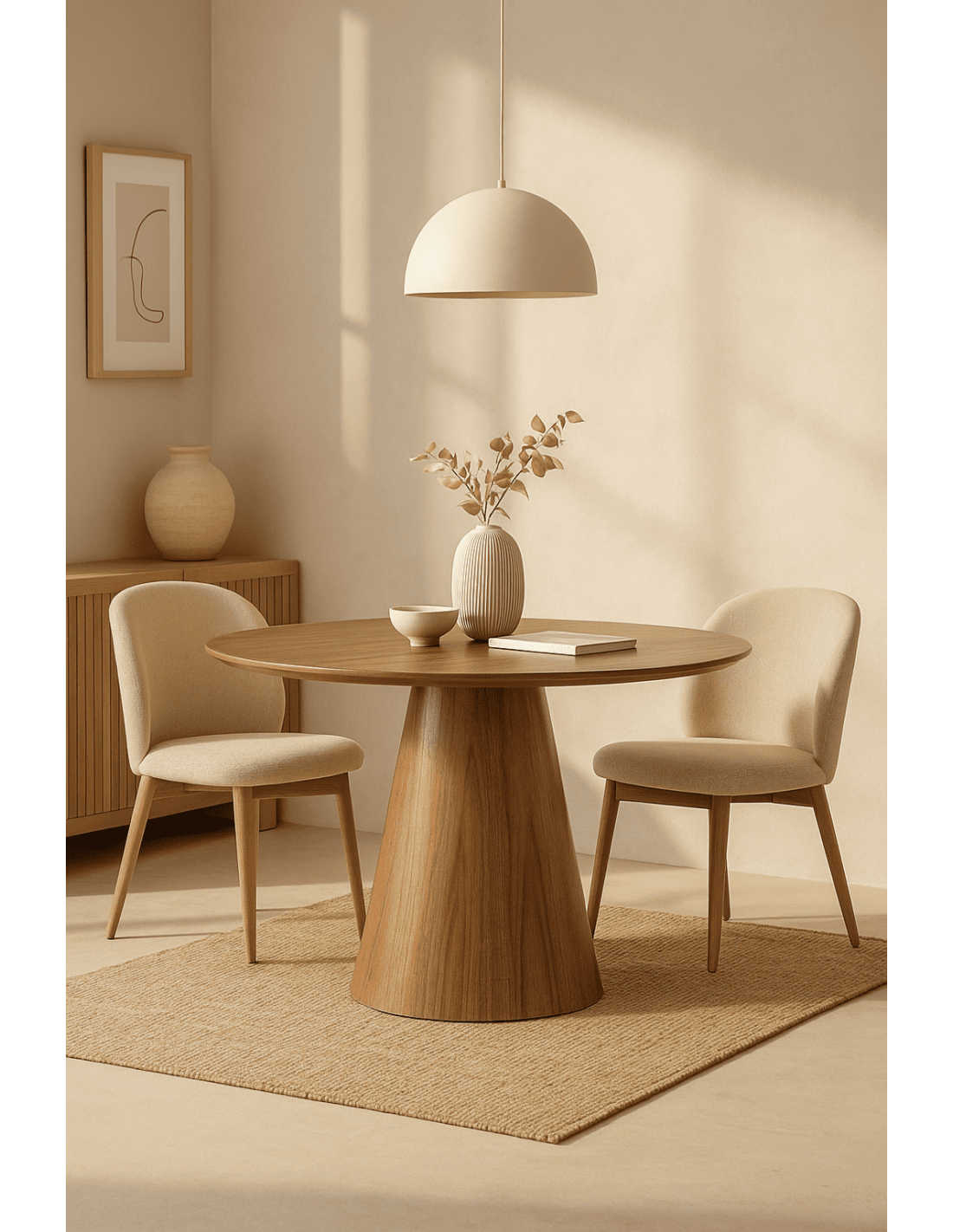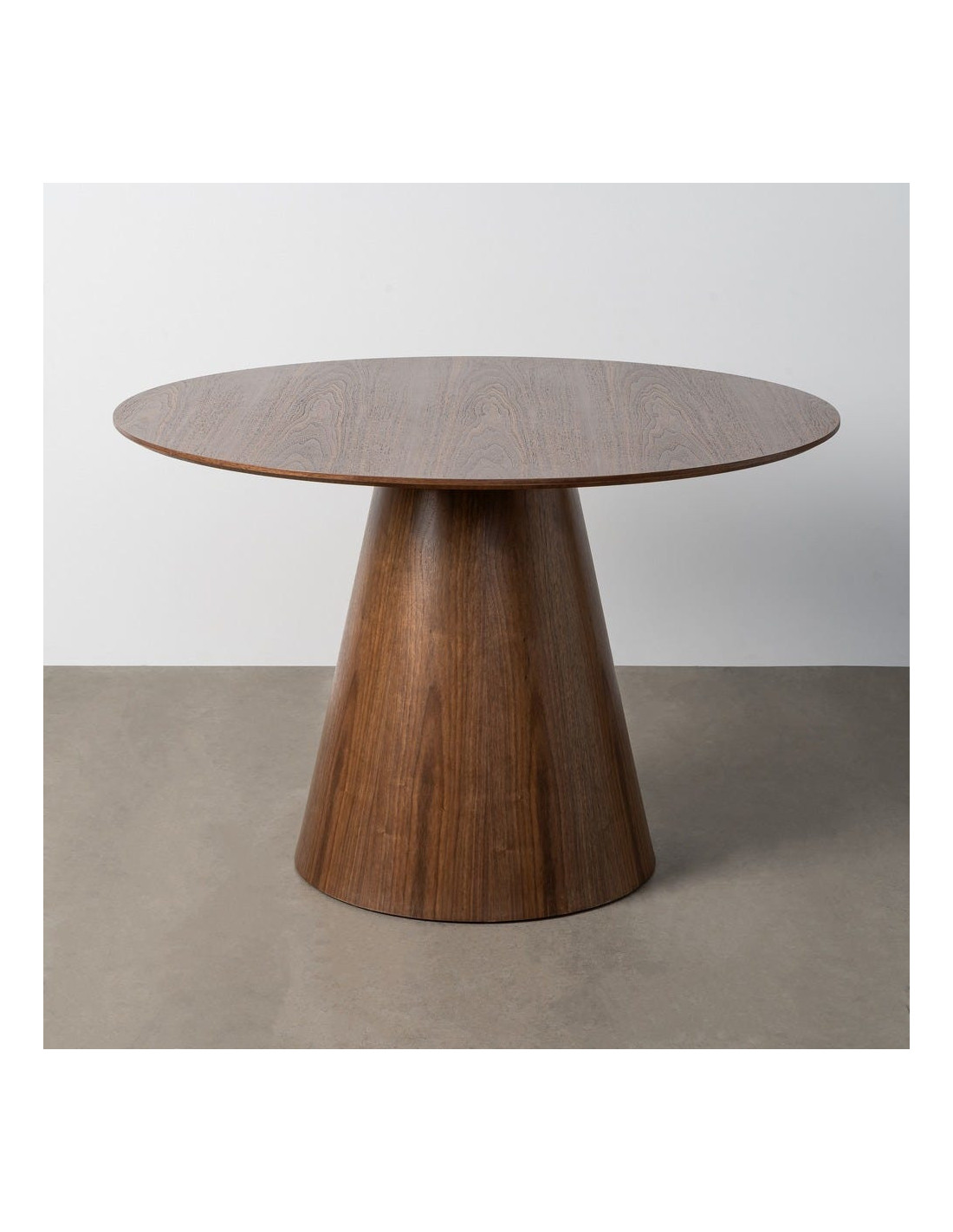 Une table ronde au charme intemporel, avec une finition bois marron chaleureuse et un pied central sculptural qui attire immédiatement le regard.