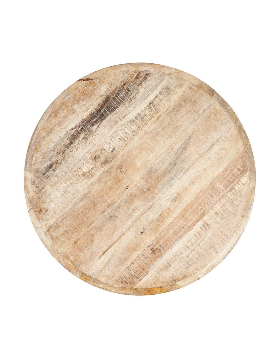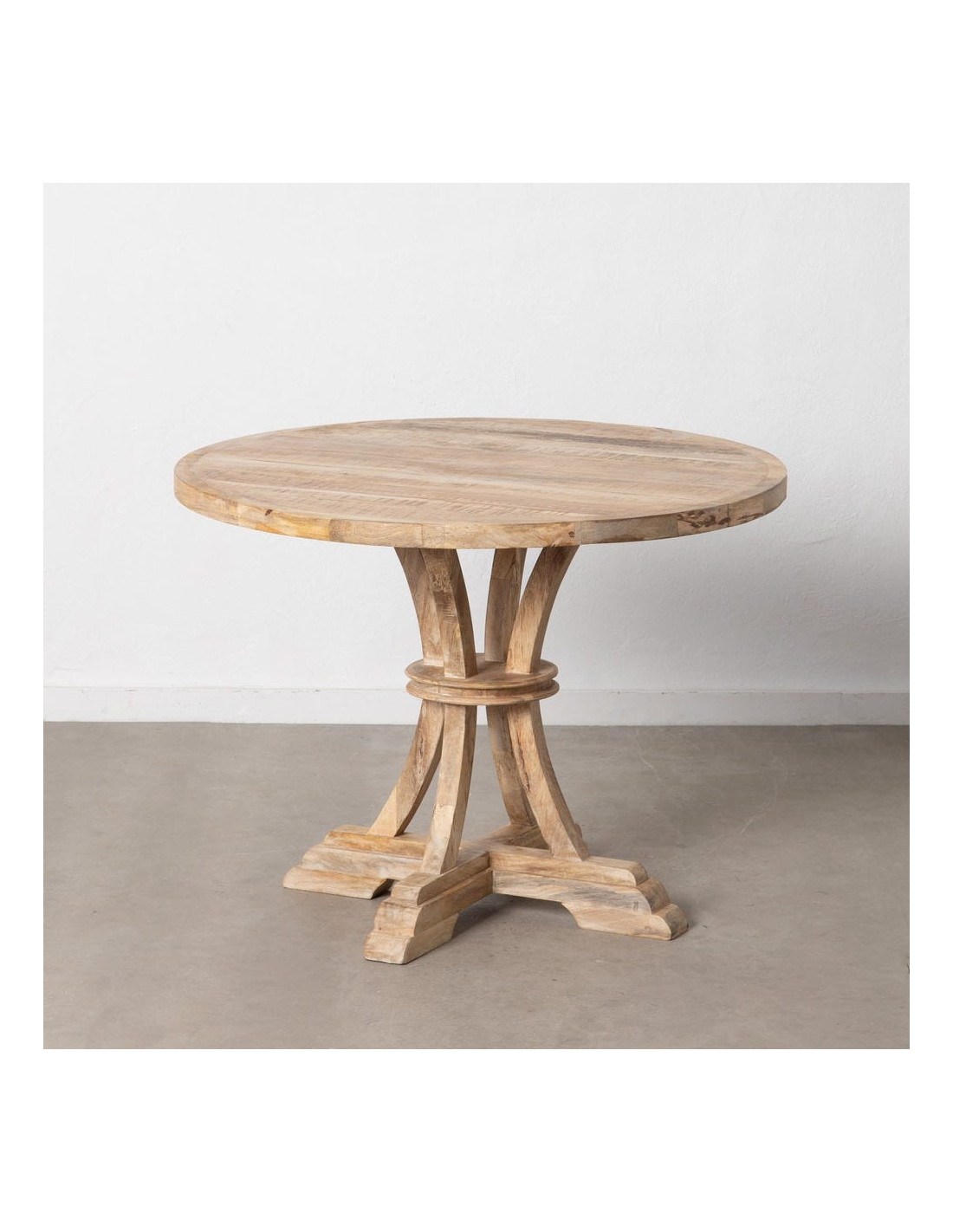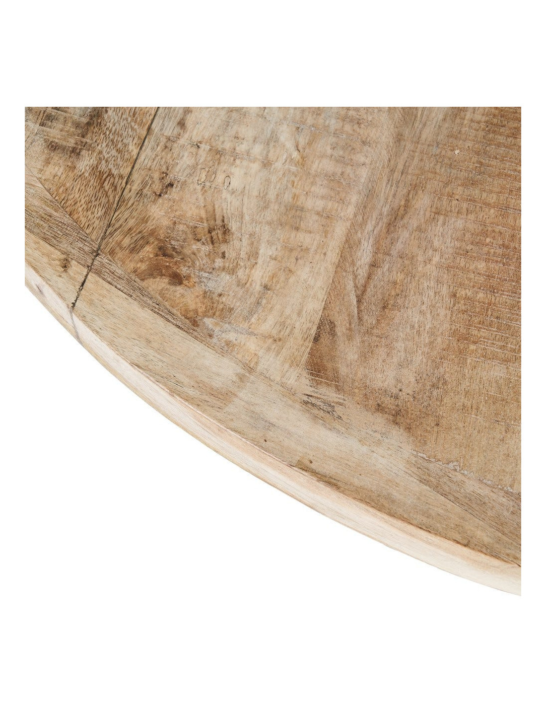 Une table ronde en bois de manguier à la patine claire, qui apporte lumière et douceur tout en conservant un caractère artisanal marqué.