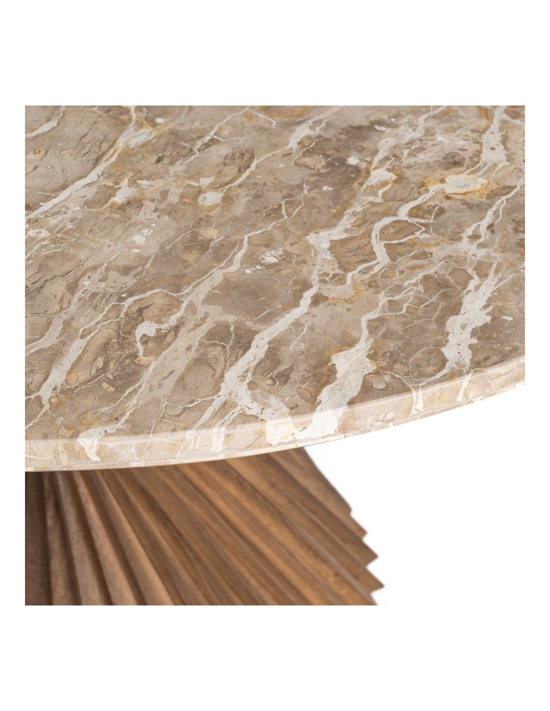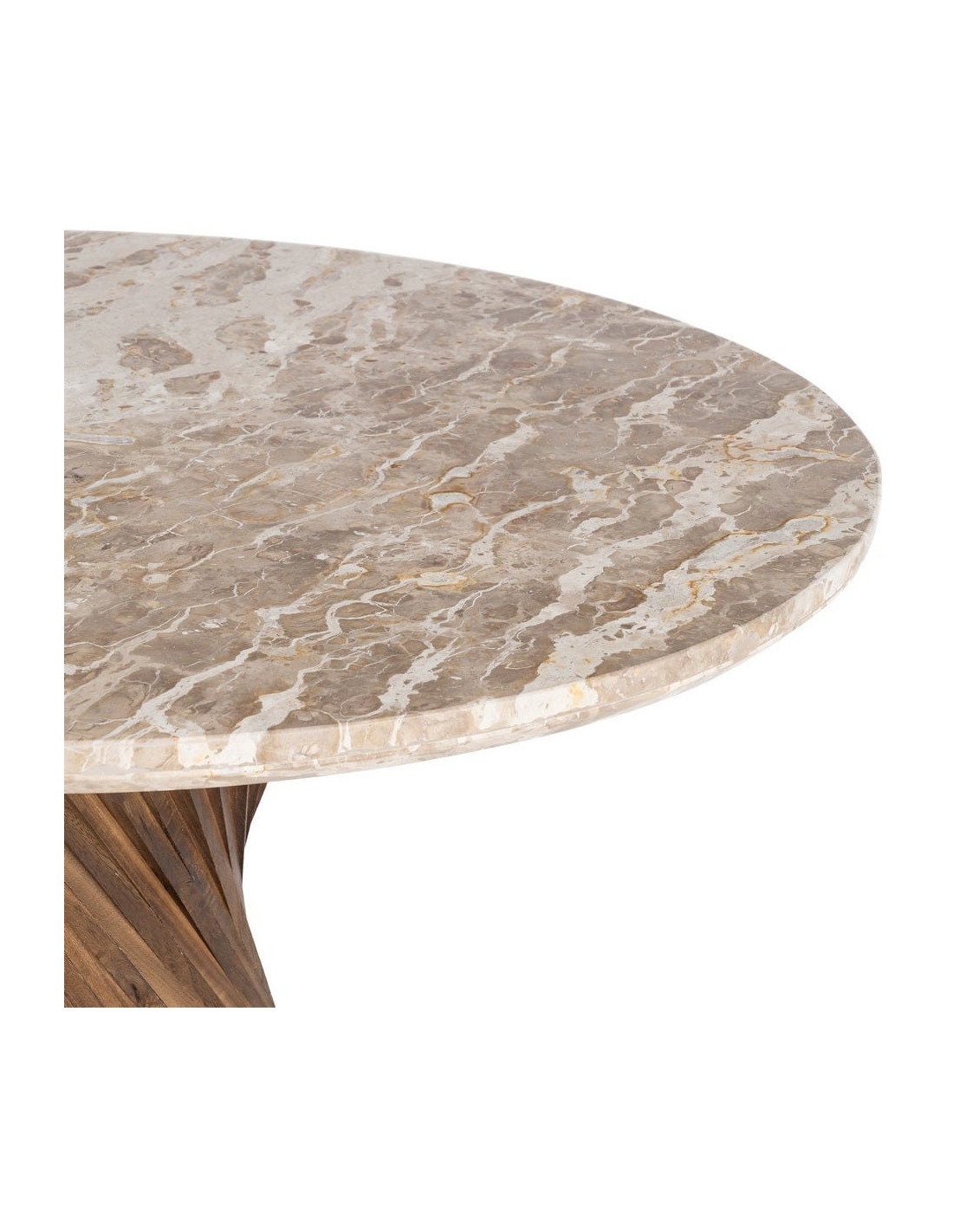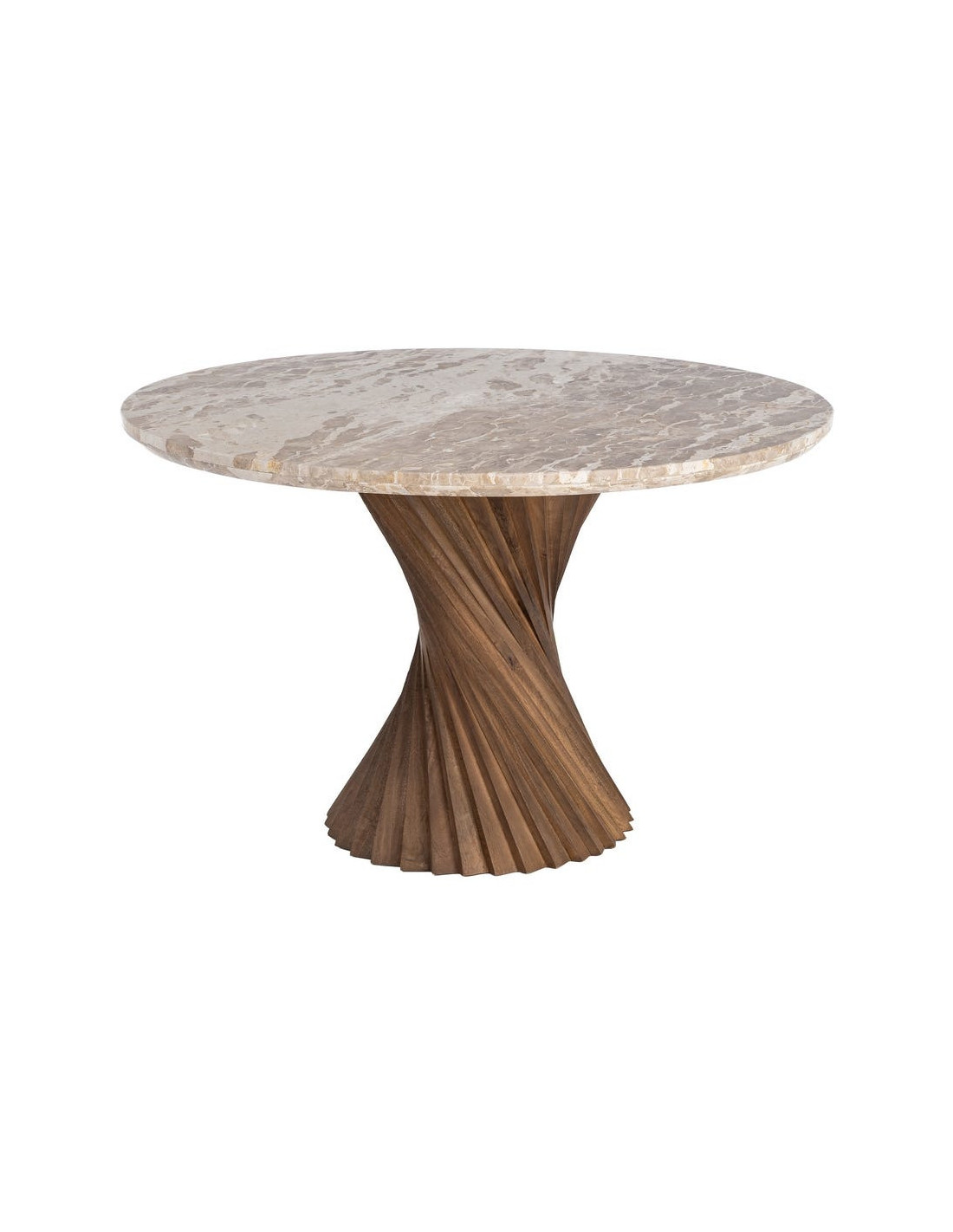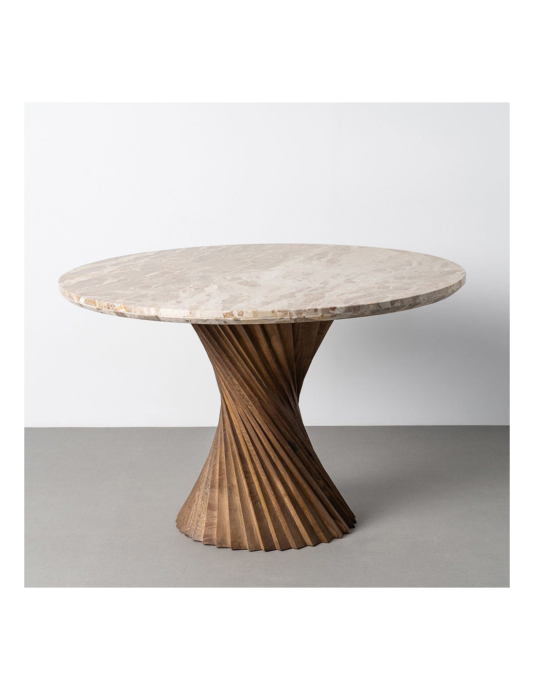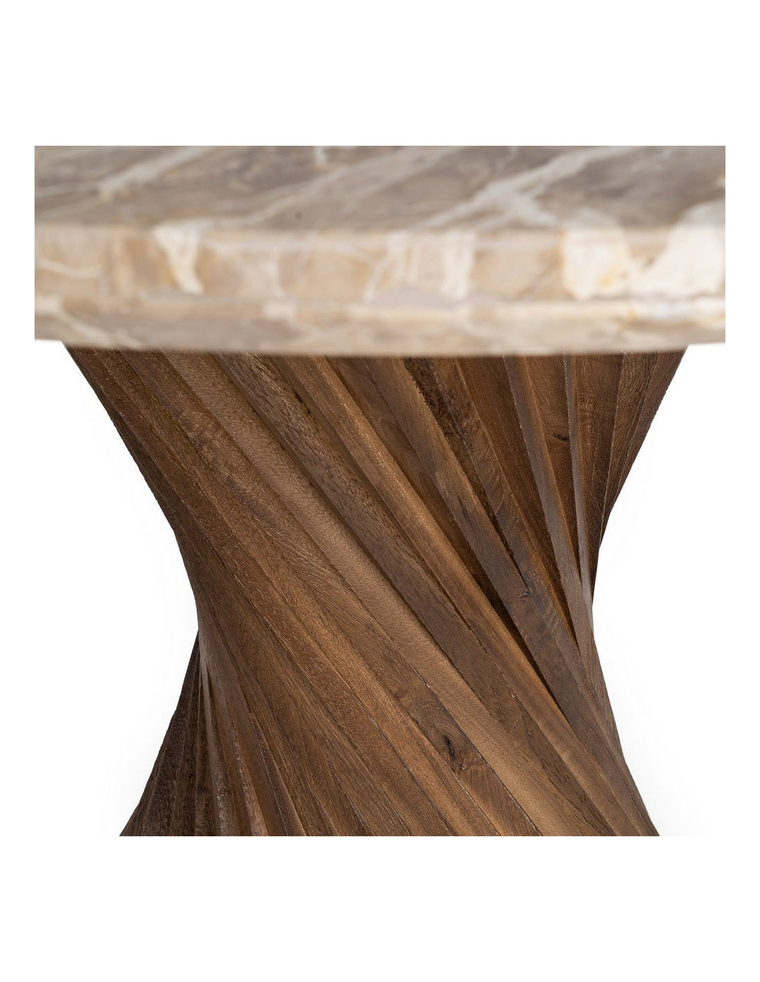 Une table sculpturale où le marbre texturé rencontre un pied torsadé en bois, pour une présence forte et élégante dans votre intérieur.