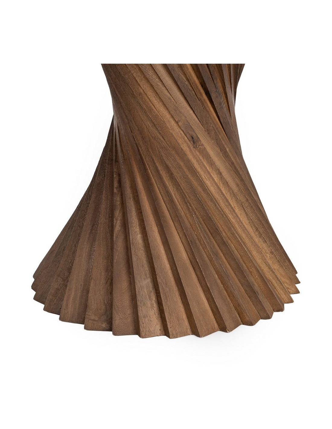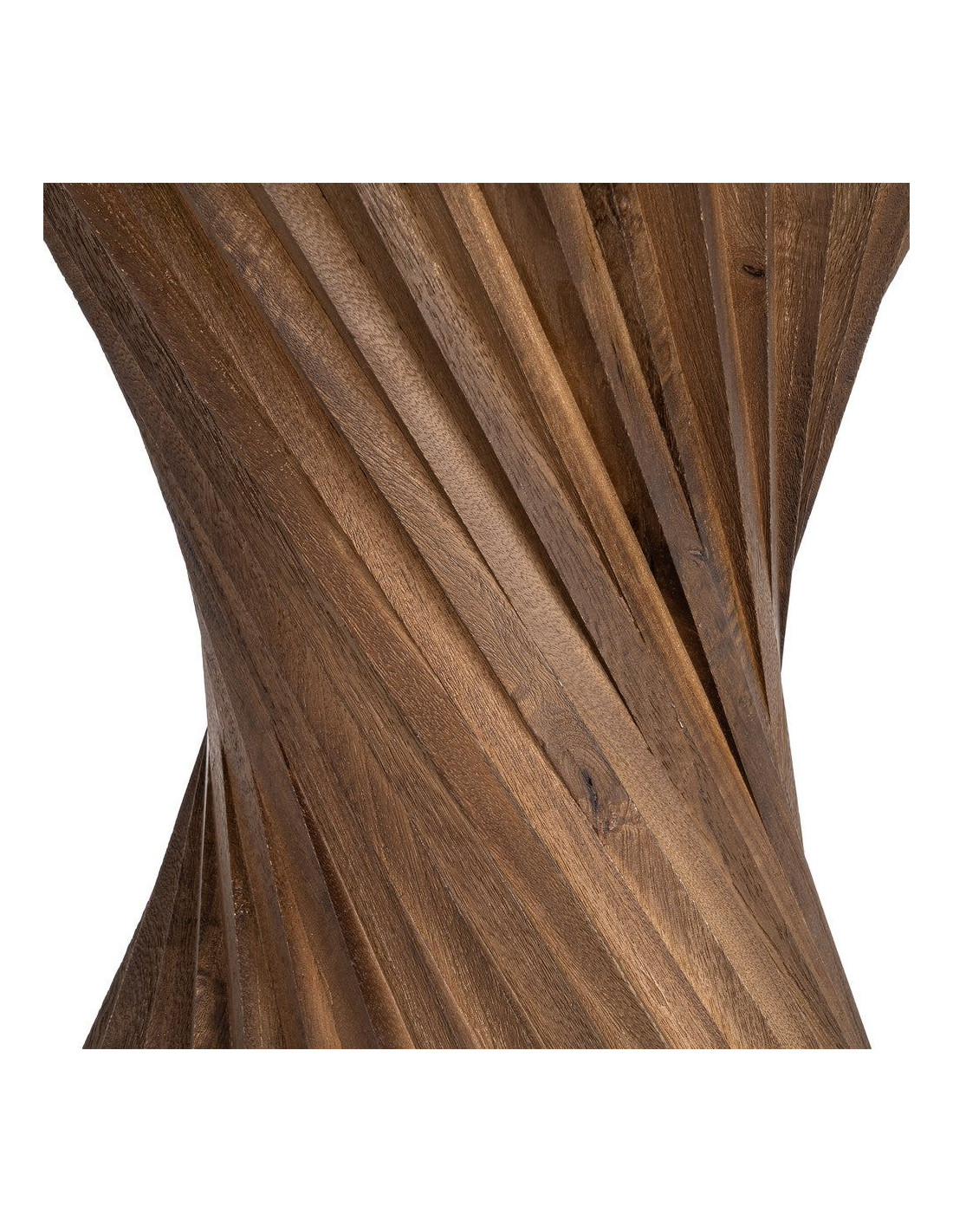 Le piètement en bois de manguier se distingue par sa structure torsadée. Ce travail de matière apporte du rythme et une dimension sculpturale à l’ensemble.