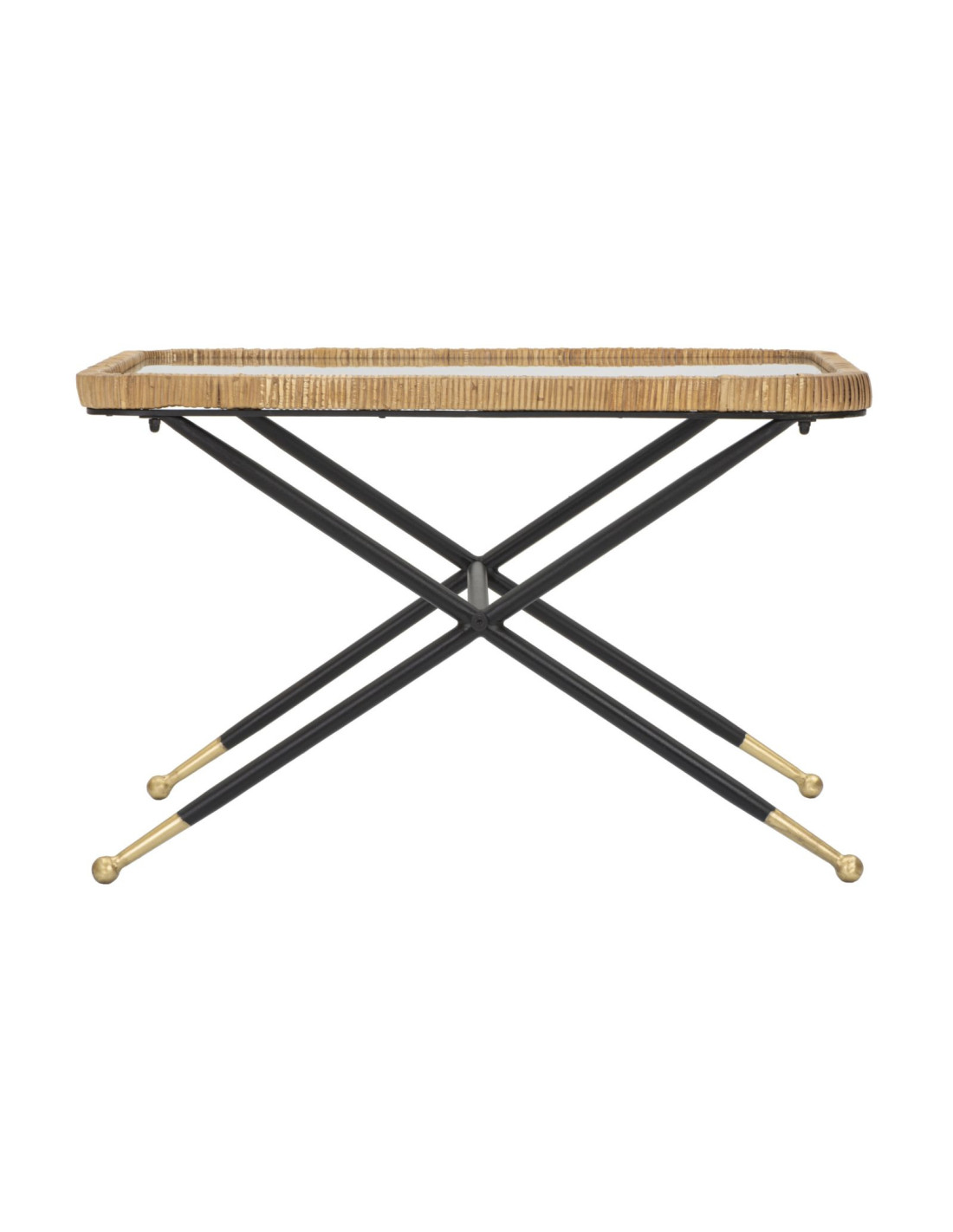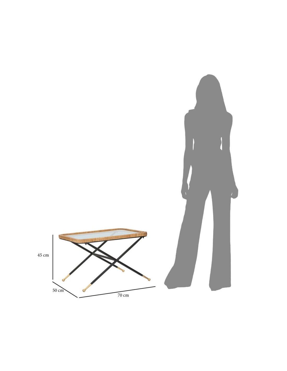 Table basse design chic bord de mer Rectangulaire Verre Transparent Rotin Naturel Tressé Métal Noir Doré Saint Barth 70 cm