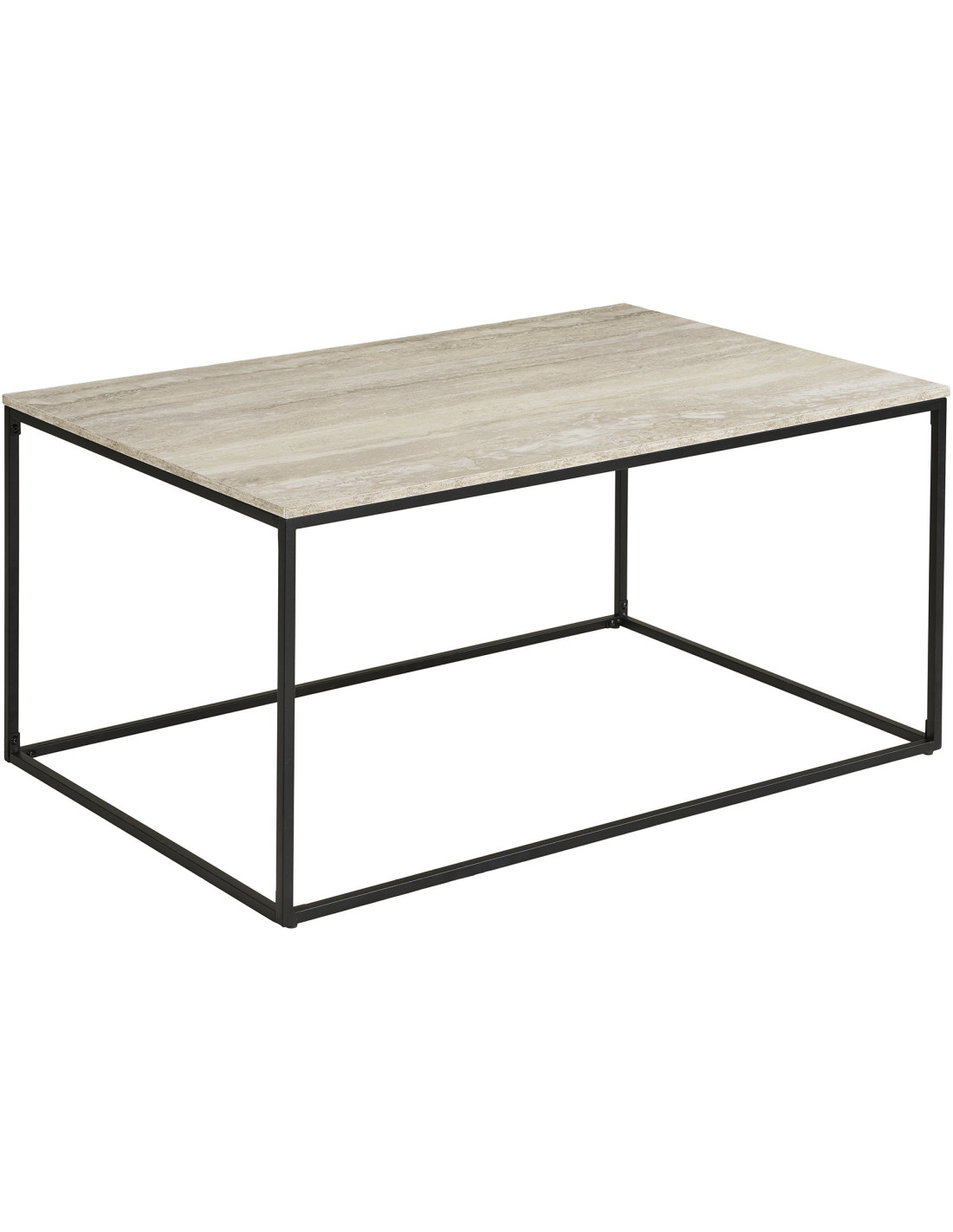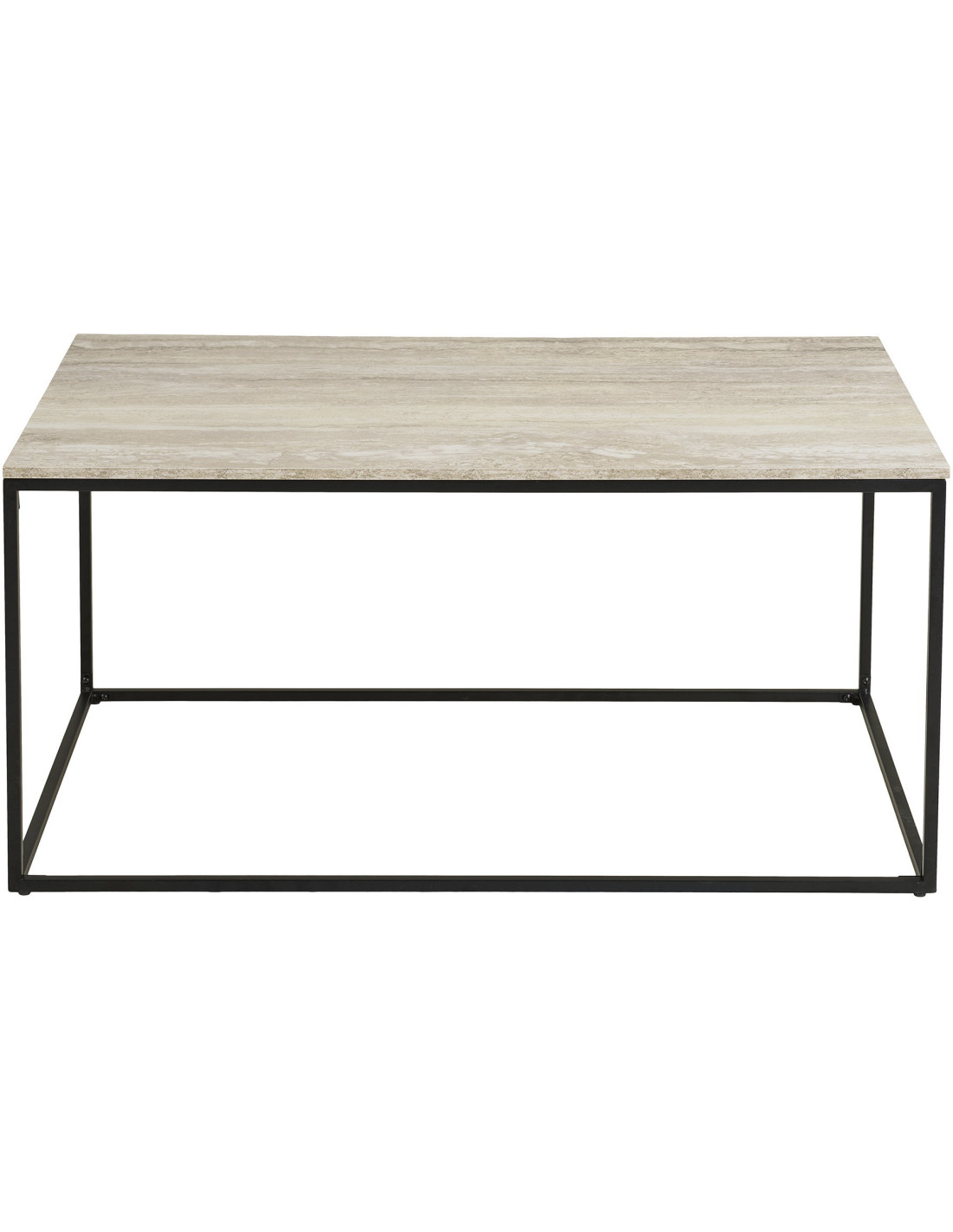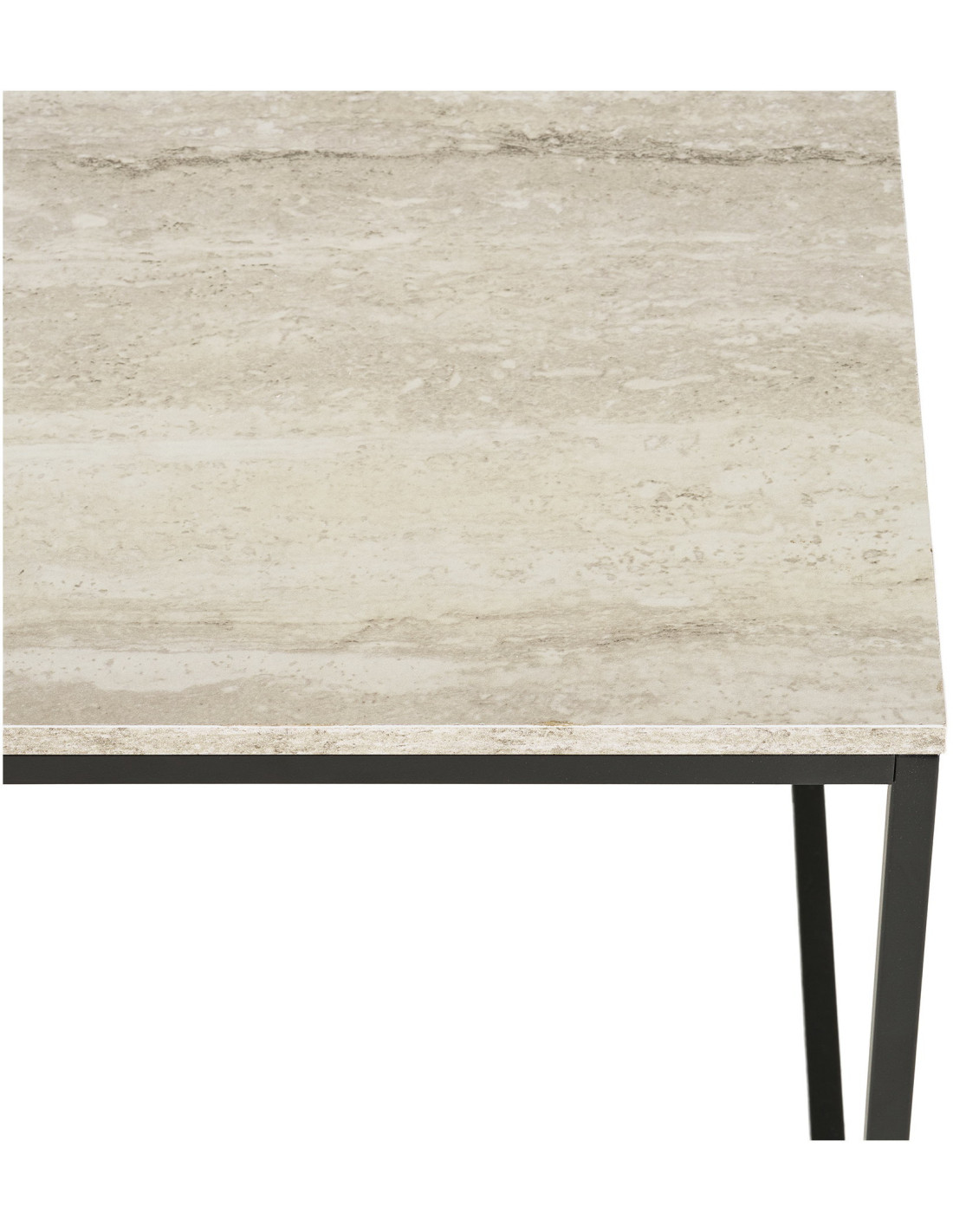 Le plateau présente une finition effet travertin aux nuances beiges naturelles qui adoucissent la structure métallique. Cette texture évoque la pierre tout en conservant une grande légèreté visuelle. Elle capte la lumière et illumine l’espace. Elle apporte une dimension chaleureuse. Elle contraste subtilement avec le noir du piètement. Elle enrichit le rendu sans surcharge. Elle valorise les objets décoratifs. Elle s’adapte à différents univers. Elle crée une ambiance apaisante. Elle renforce le caractère du meuble.