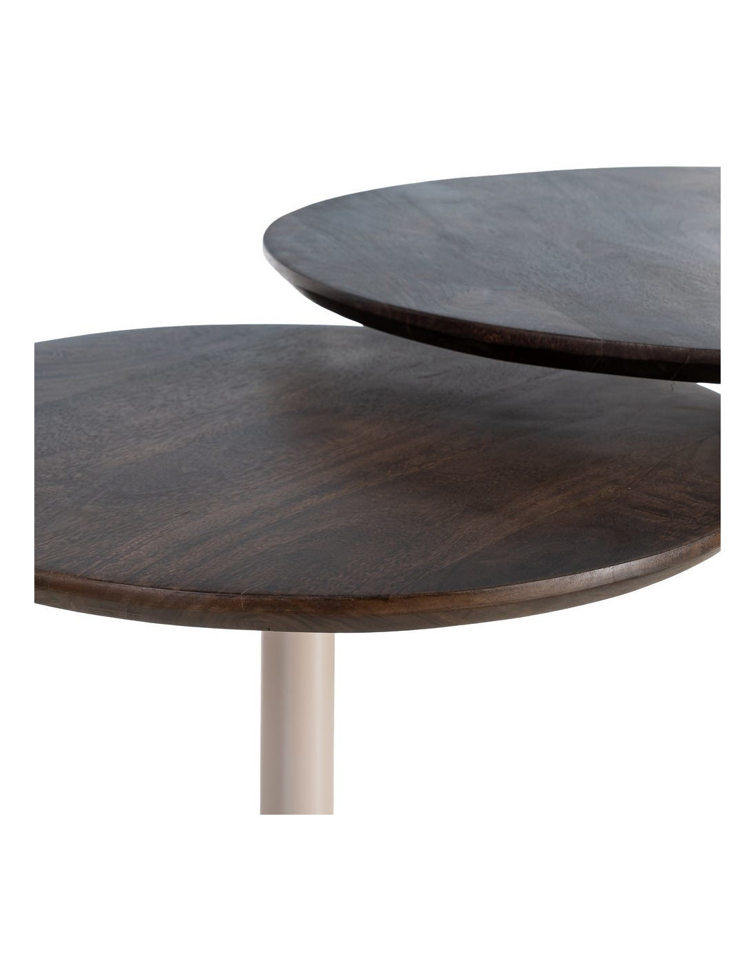 Table basse gigogne ronde en métal beige et marron. Design industriel et chic. Rangement pratique et élégant.