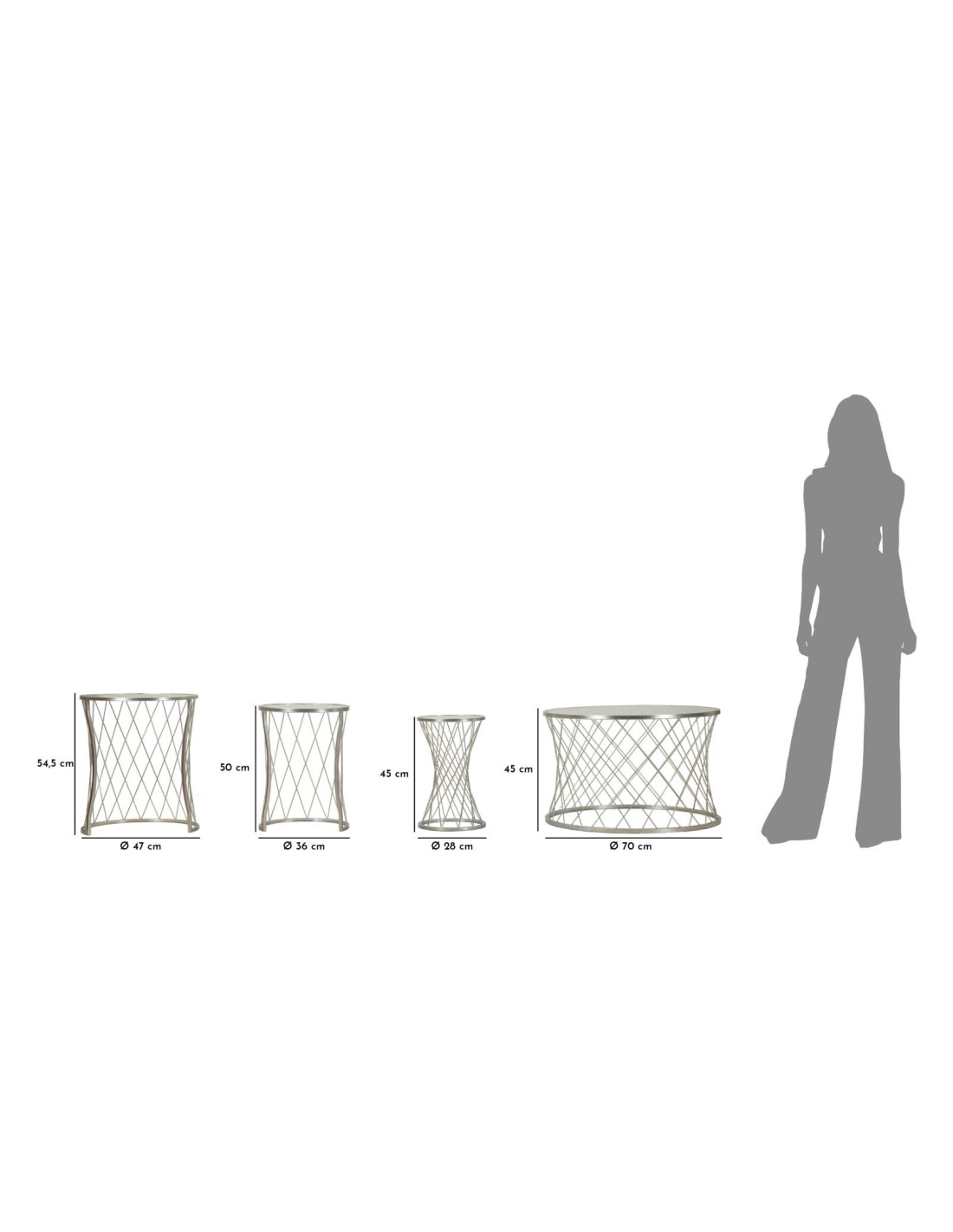 Dimensions des 4 tables : Ø 70 x 45 cm - 47 x 54,5 cm - 36,8 x 49,6 cm - 27,8 x 45 cm