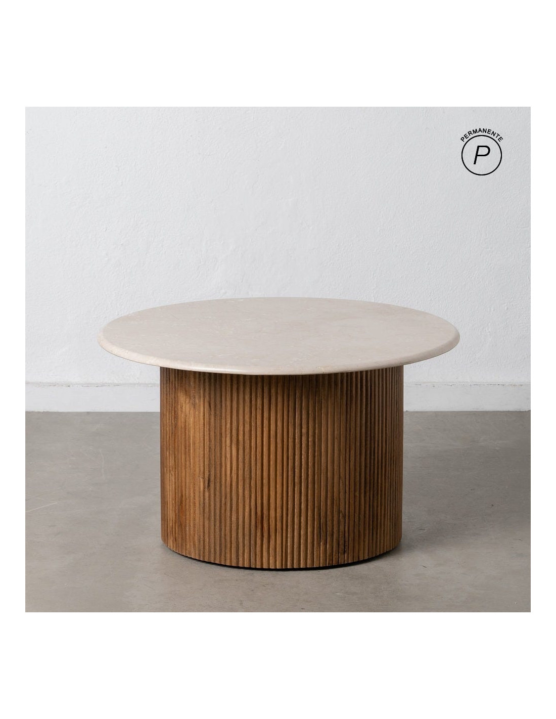 Table basse moderne chic Ronde 76 cm en Marbre Blanc crème Bois de manguier Naturel Relina