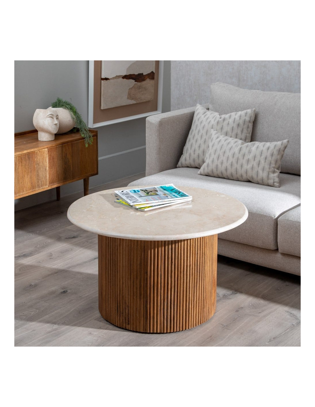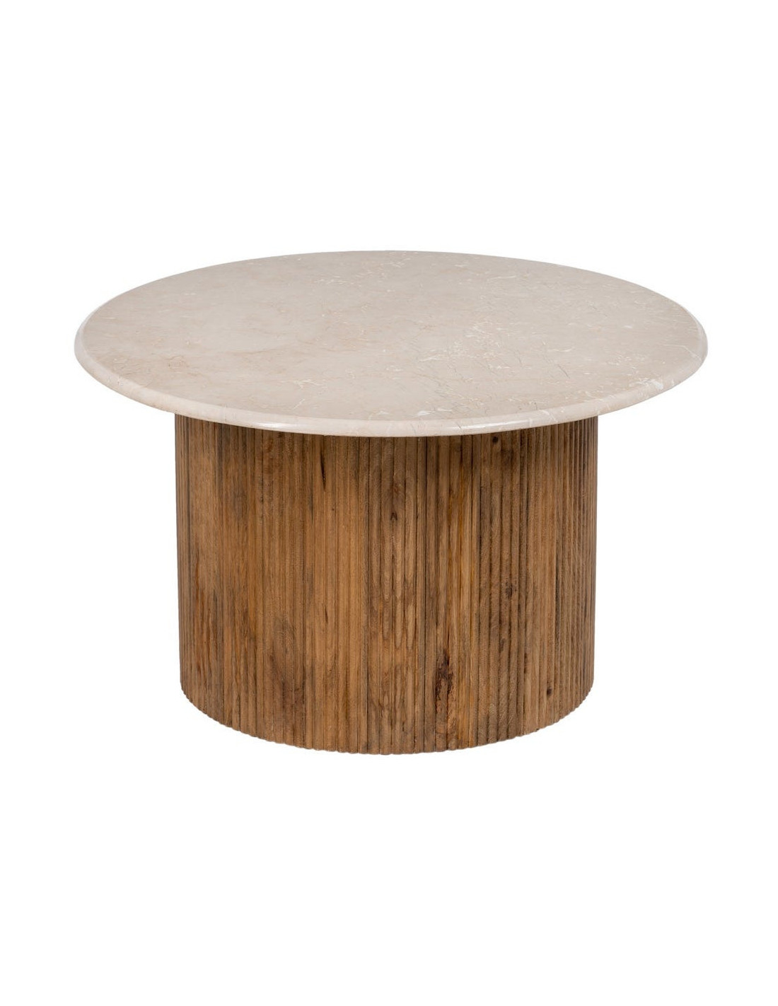 Table basse moderne chic Ronde 76 cm en Marbre Blanc crème Bois de manguier Naturel Relina - 1