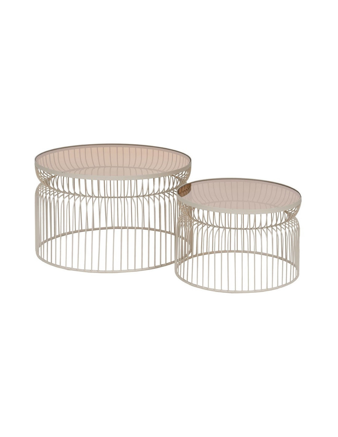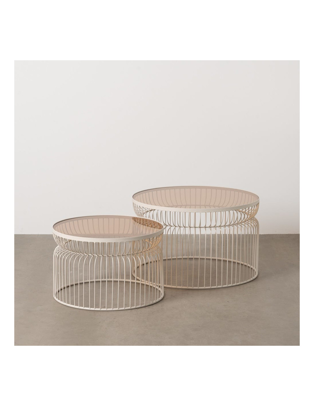 Table basse moderne grillage Ronde en Métal Blanc crème Verre Transparent Henia (Lot de 2) - 1