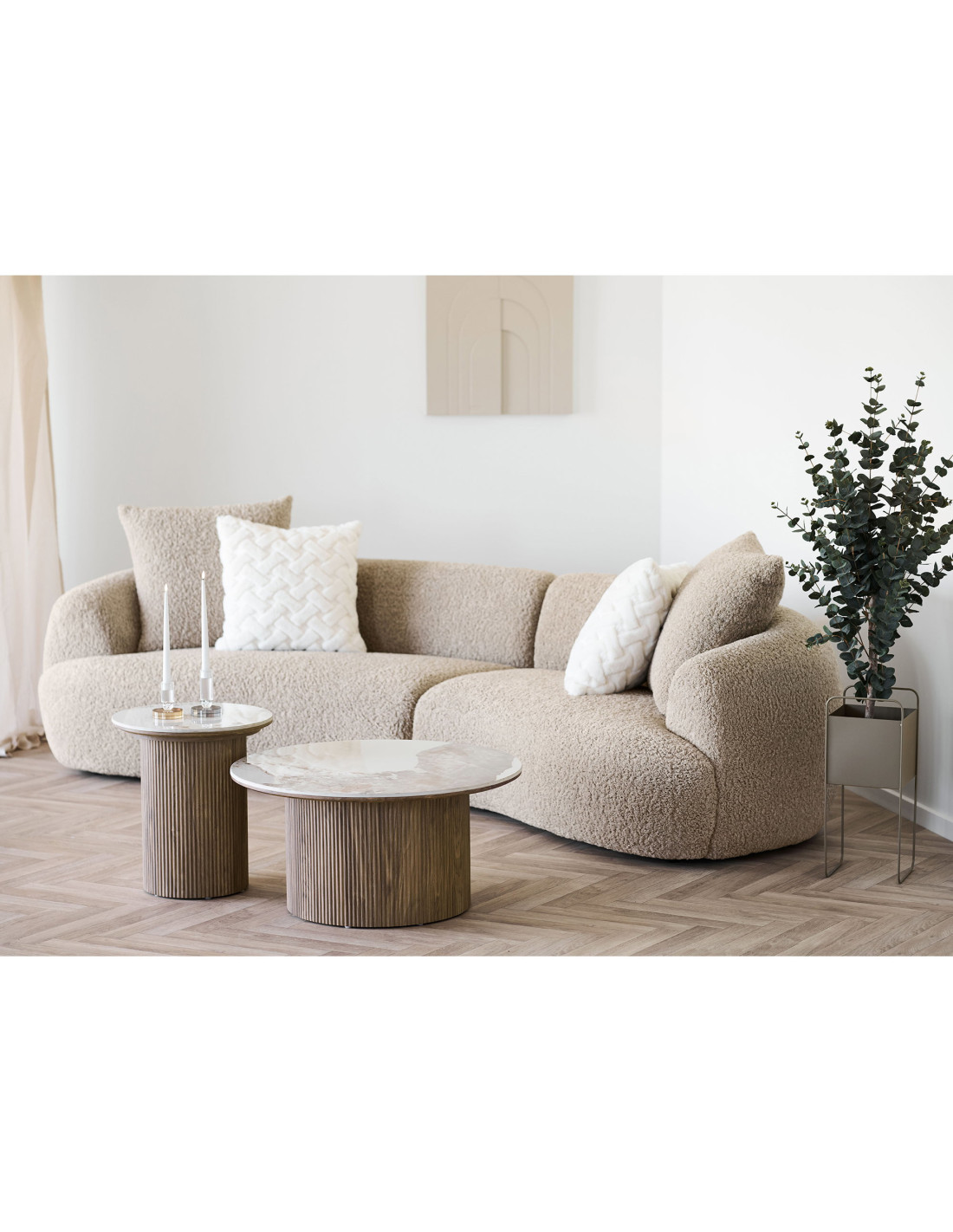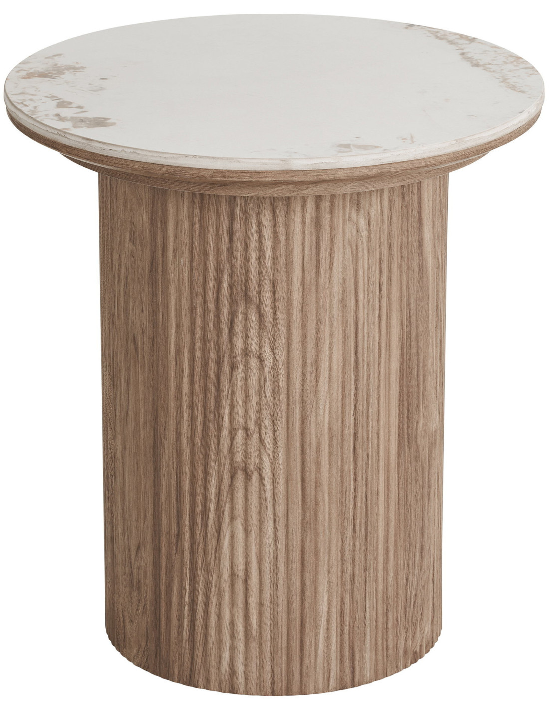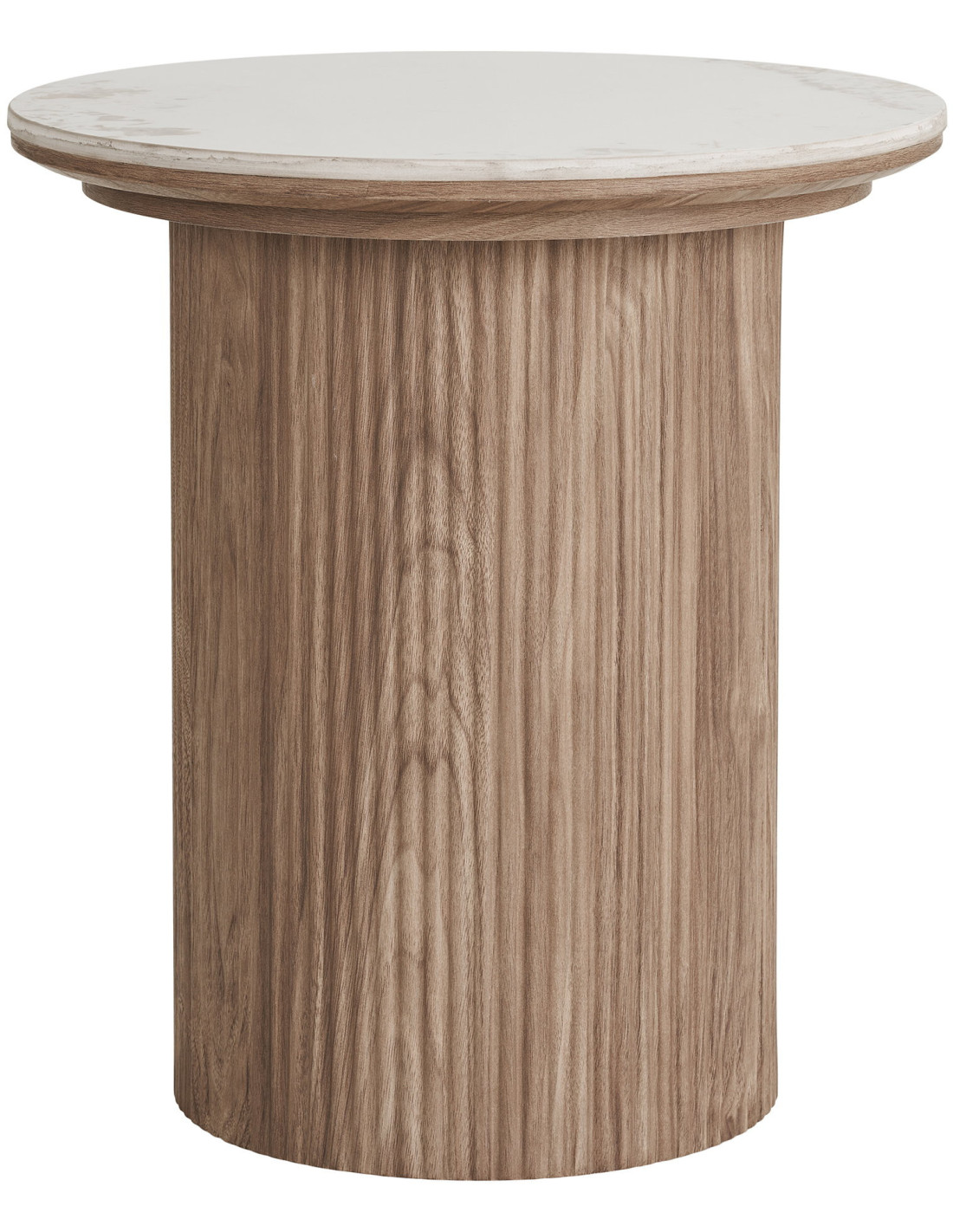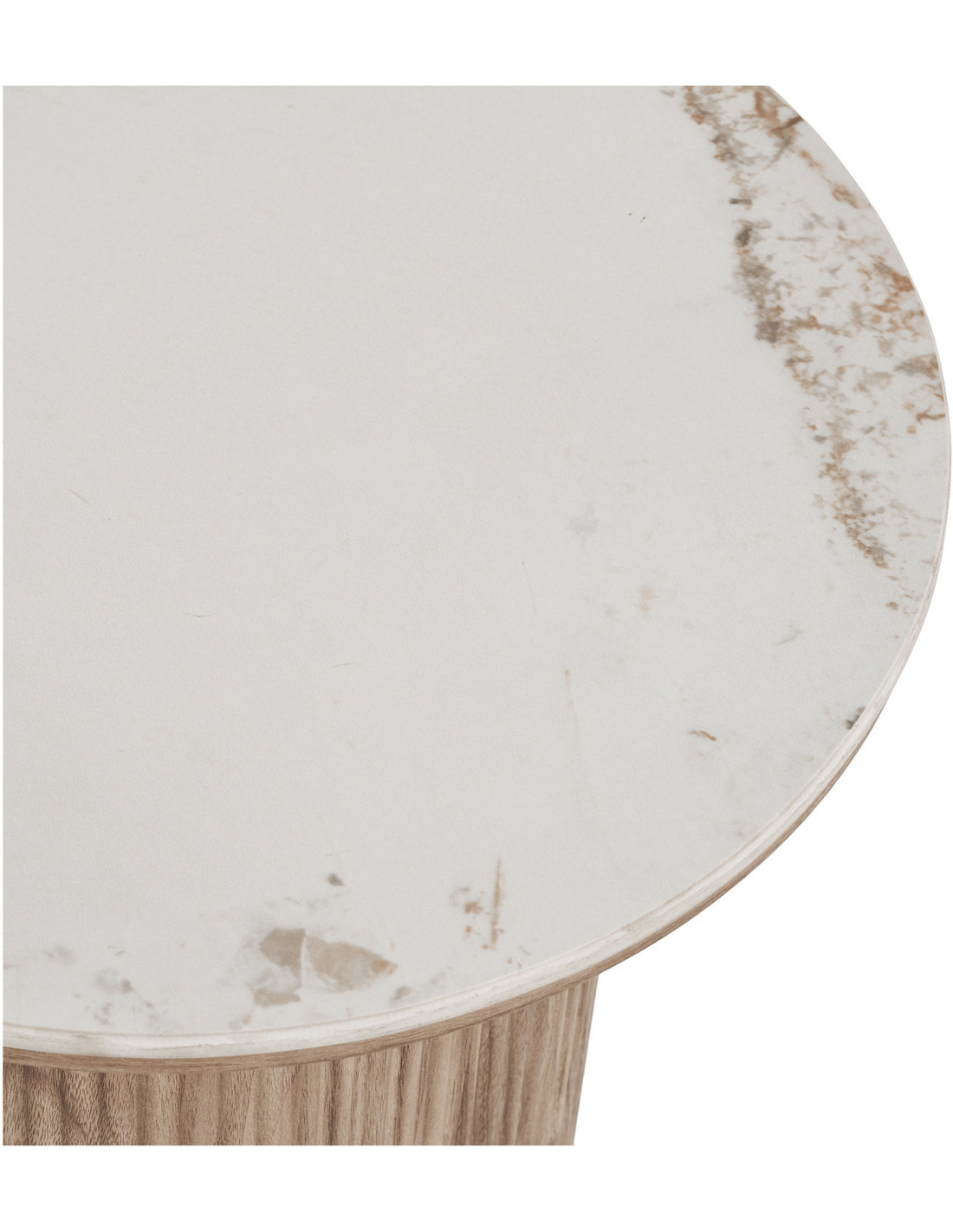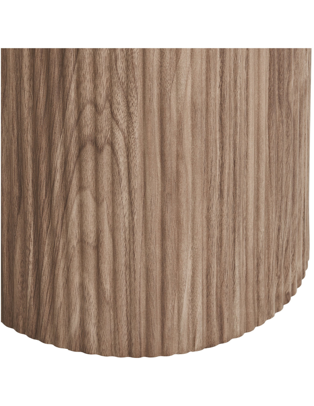 Le piètement plein donne à la table une silhouette stable et ancrée. Sa texture verticale effet bois apporte du rythme et contraste avec la douceur du plateau.