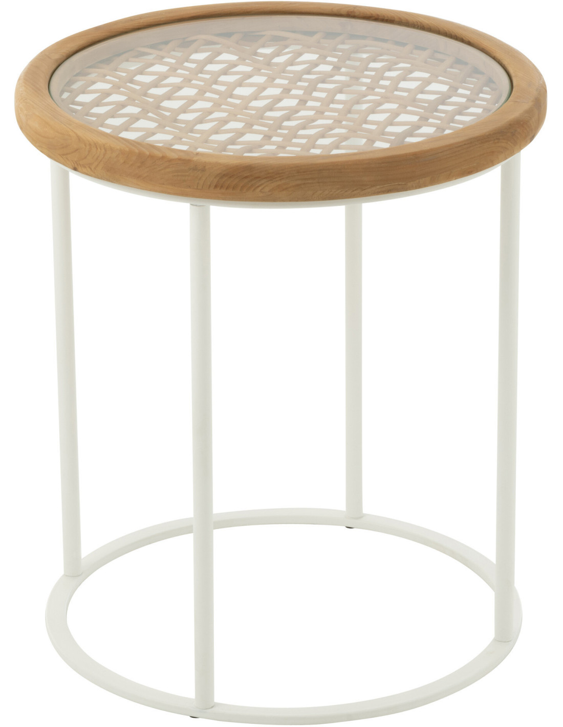 Table d'appoint bord de mer Ronde en Bois d'épicéa Naturel Verre Transparent Métal Blanc Motif cannage Mati