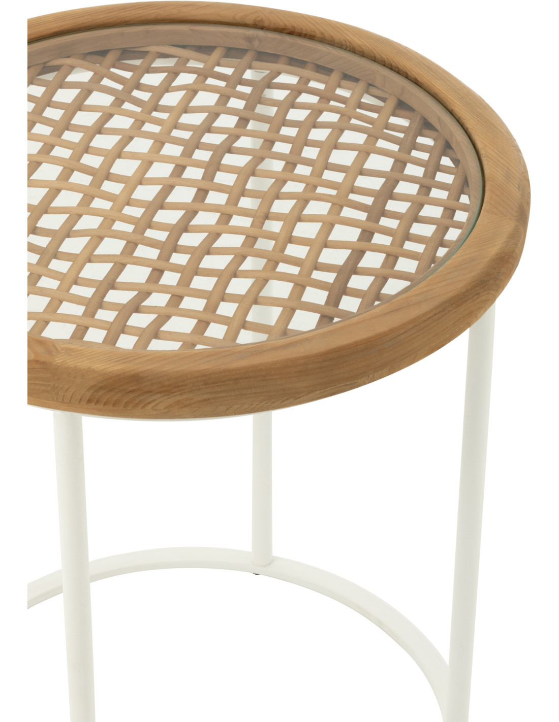 Table d'appoint bord de mer Ronde en Bois d'épicéa Naturel Verre Transparent Métal Blanc Motif cannage Mati - 3