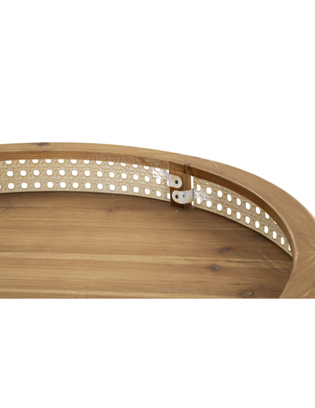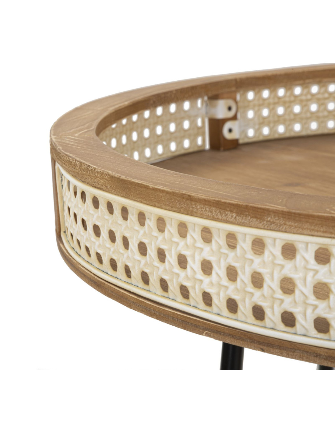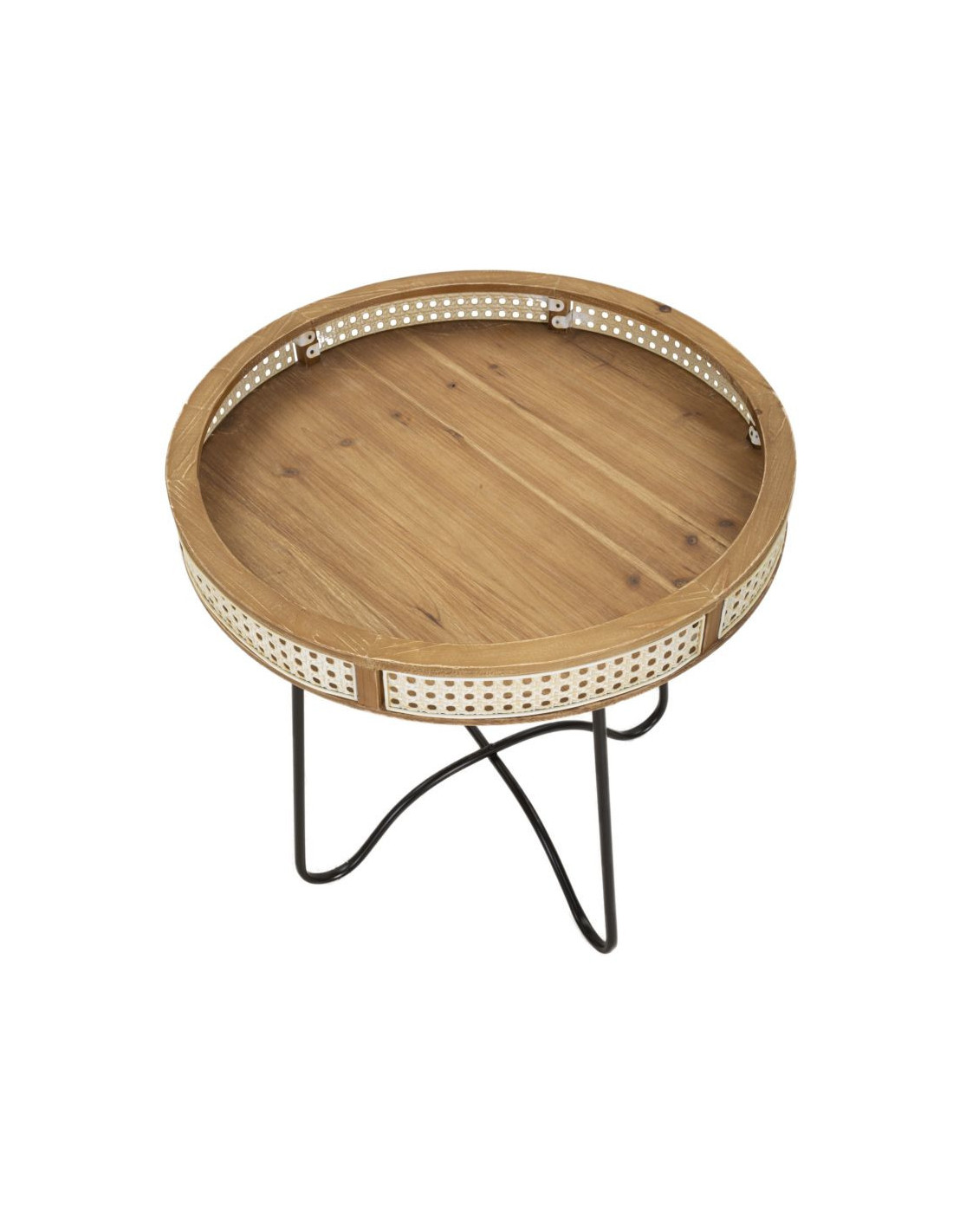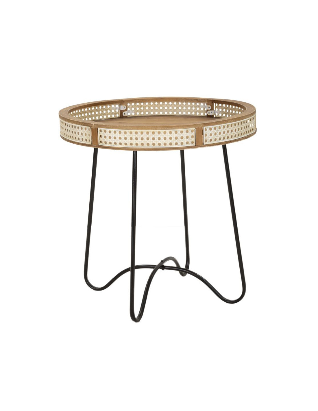 Table d'appoint design bohème chic Ronde Bois de sapin Naturel Métal Beige Effet cannage Noir Fuji 60 cm