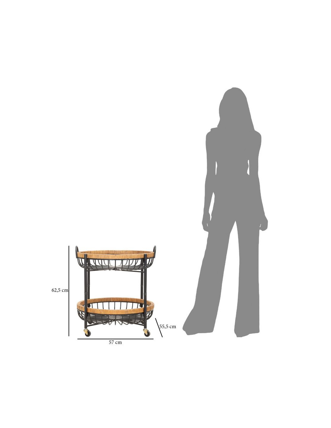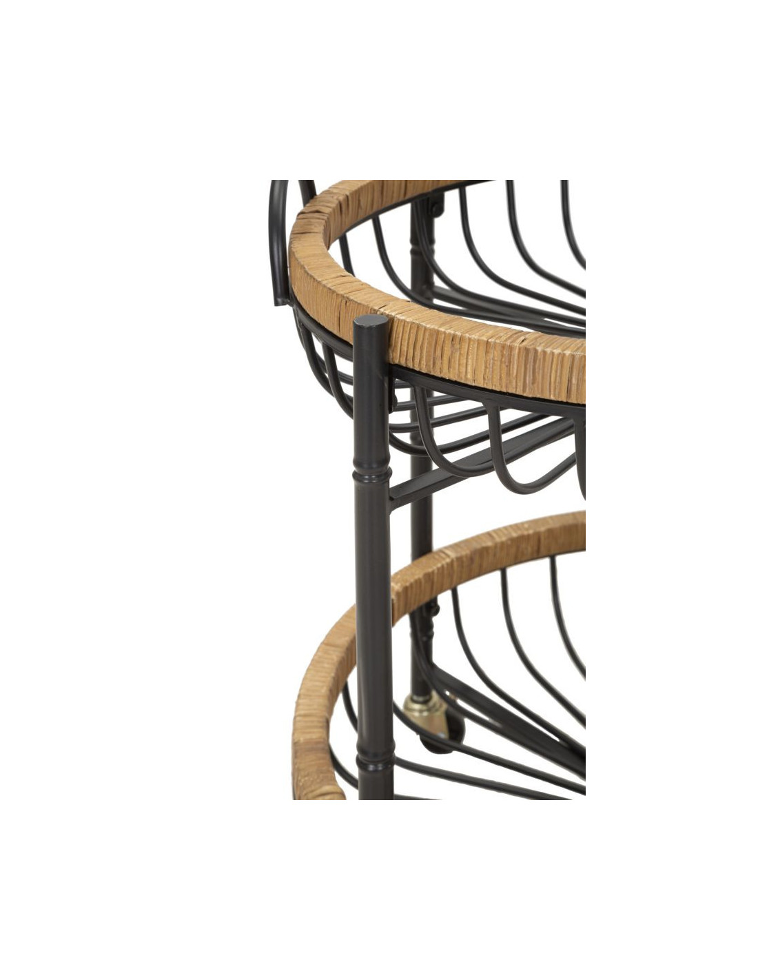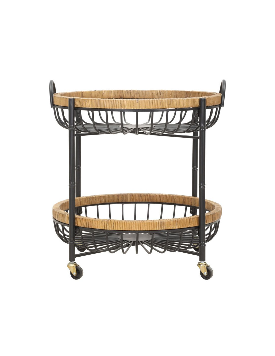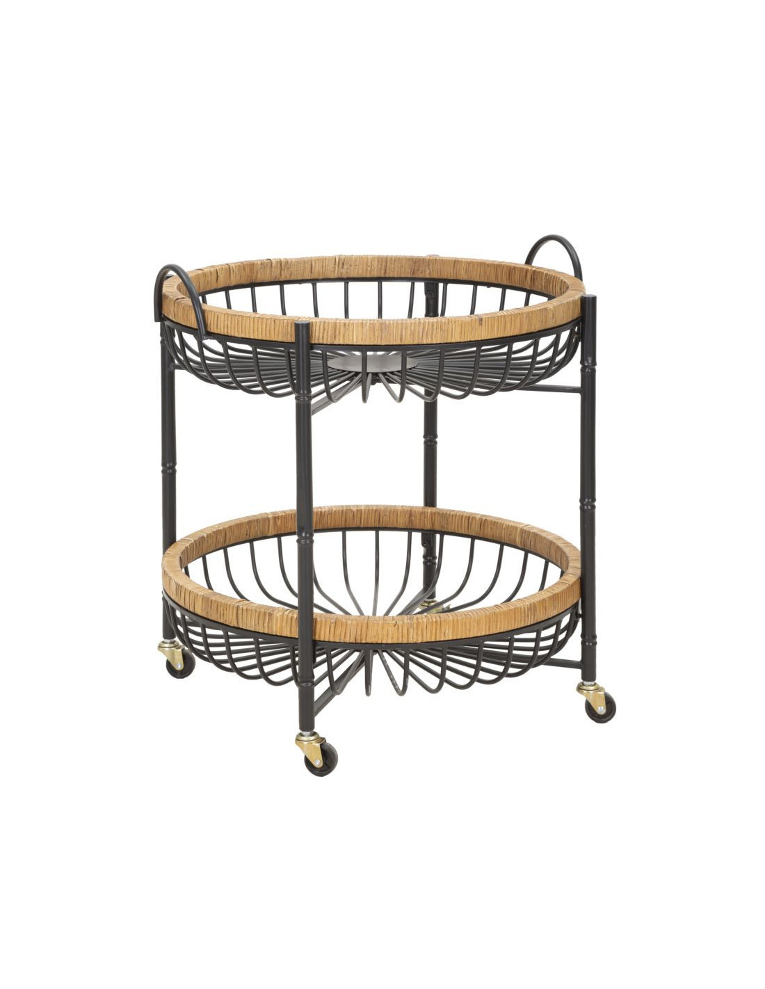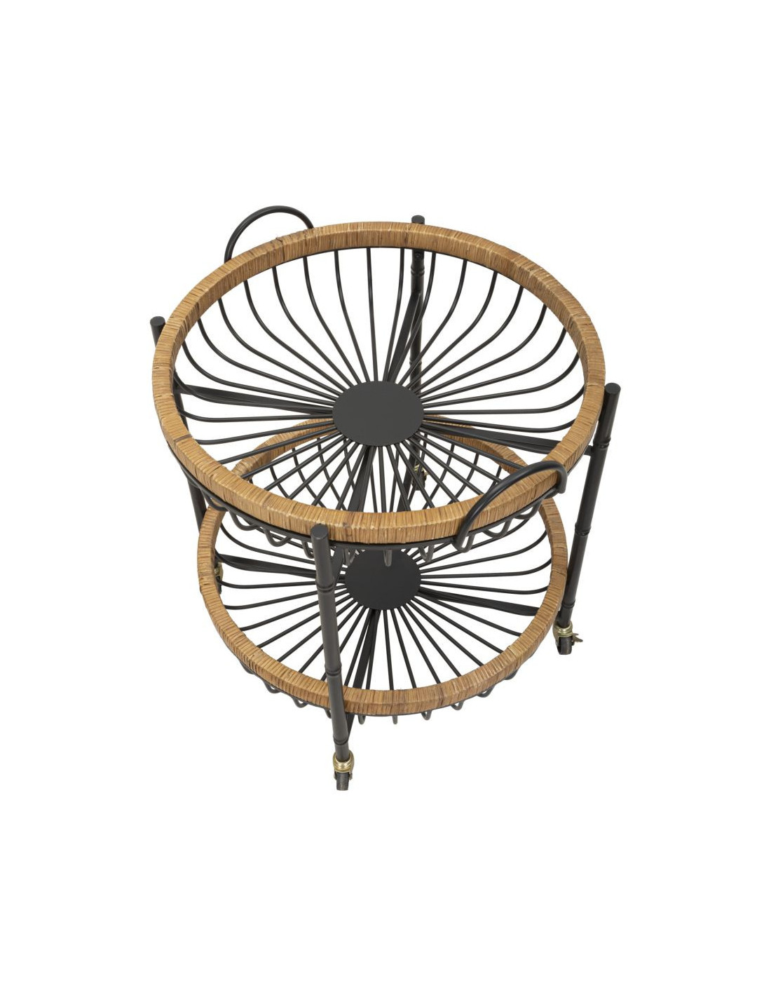 Table d'appoint design bohème sur roues Ronde 2 niveaux Rotin Naturel Tressé Métal Noir Cestino