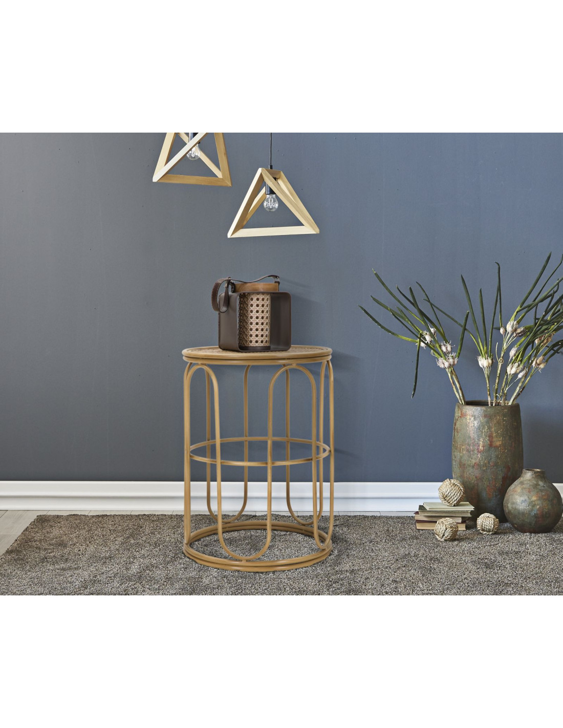 Table 'appoint design rétro chic Ronde Rotin Naturel Tressé Métal Samui