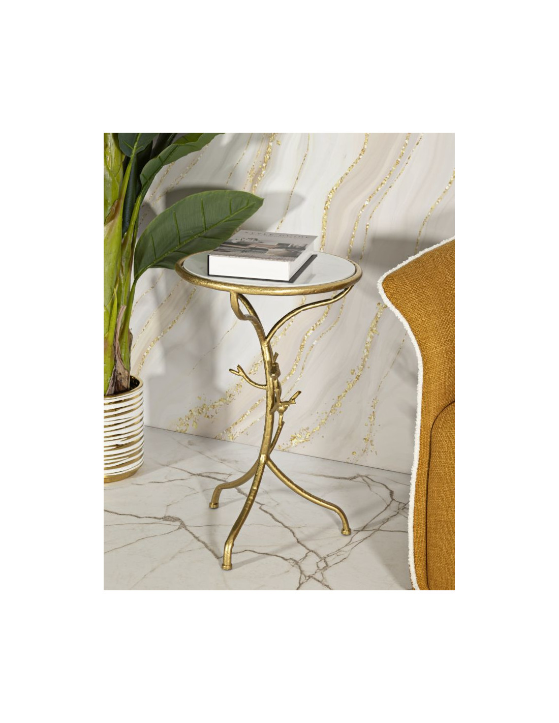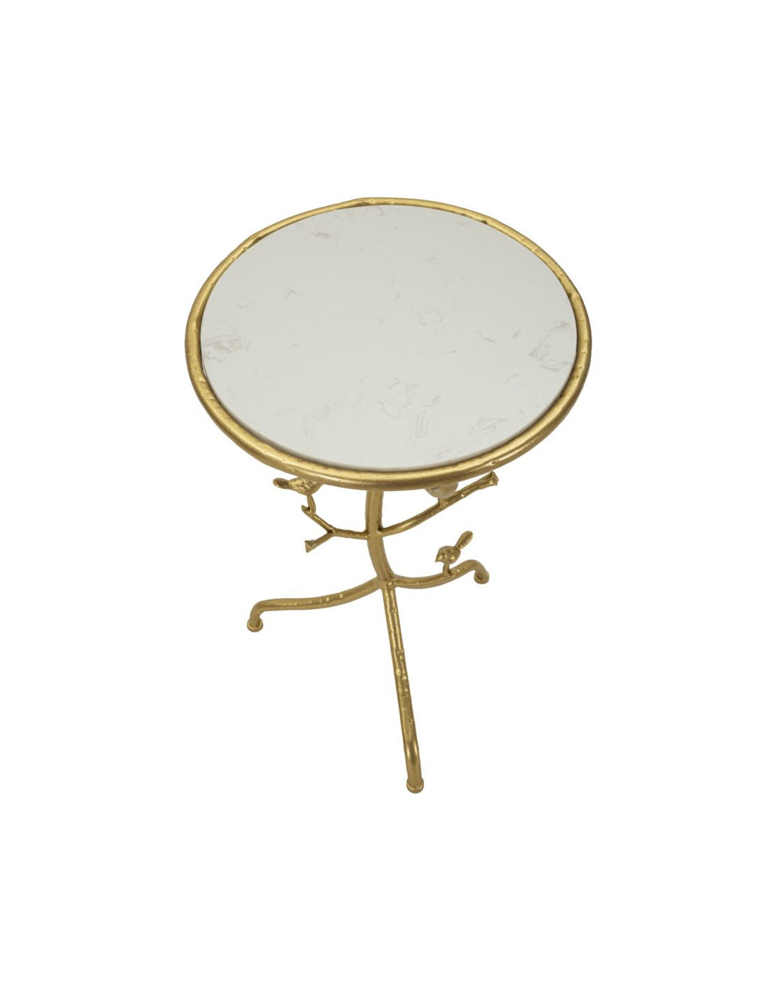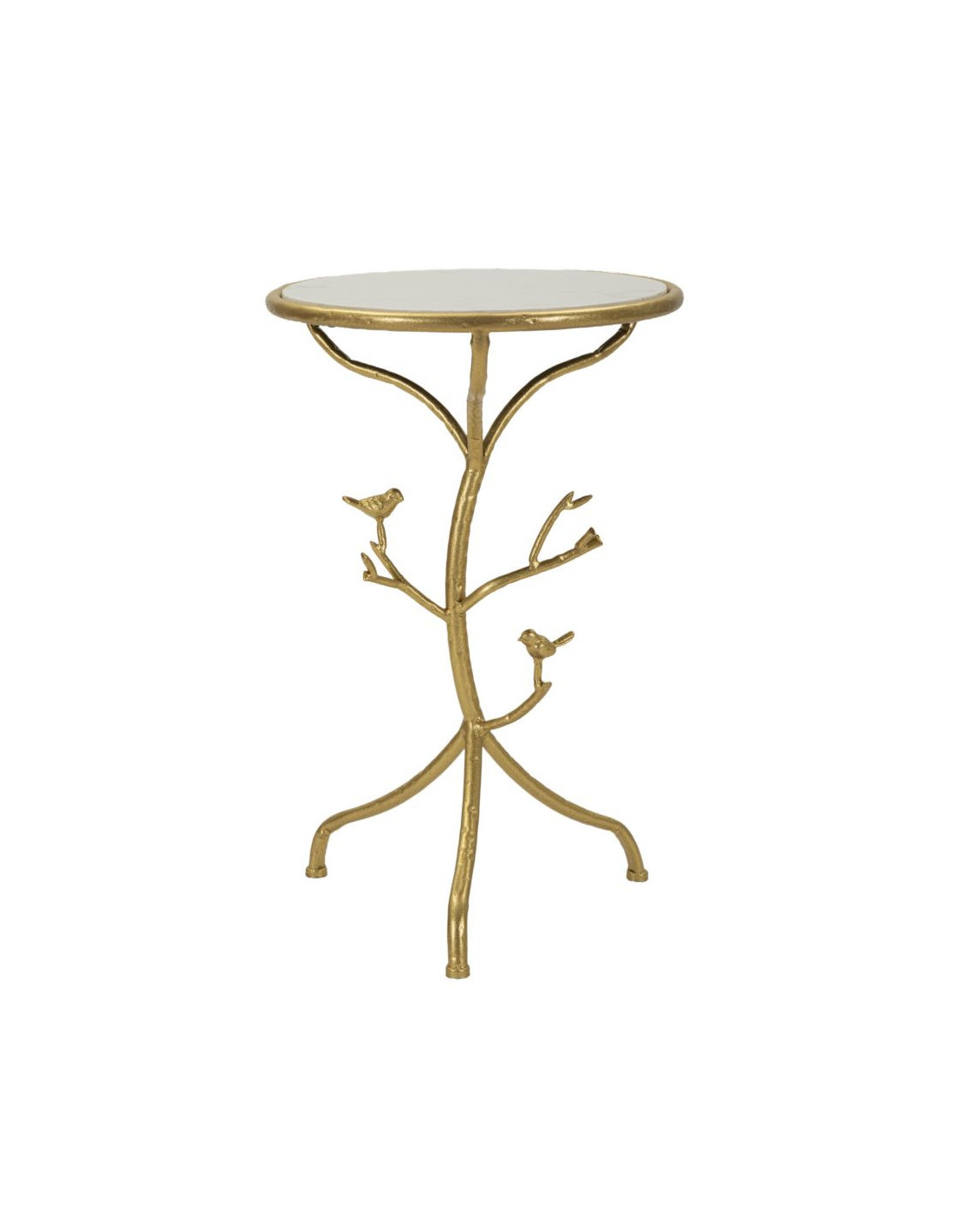 Table d'appoint moderne chic Ronde Métal Doré Motif oiseaux Marbre Blanc Birds