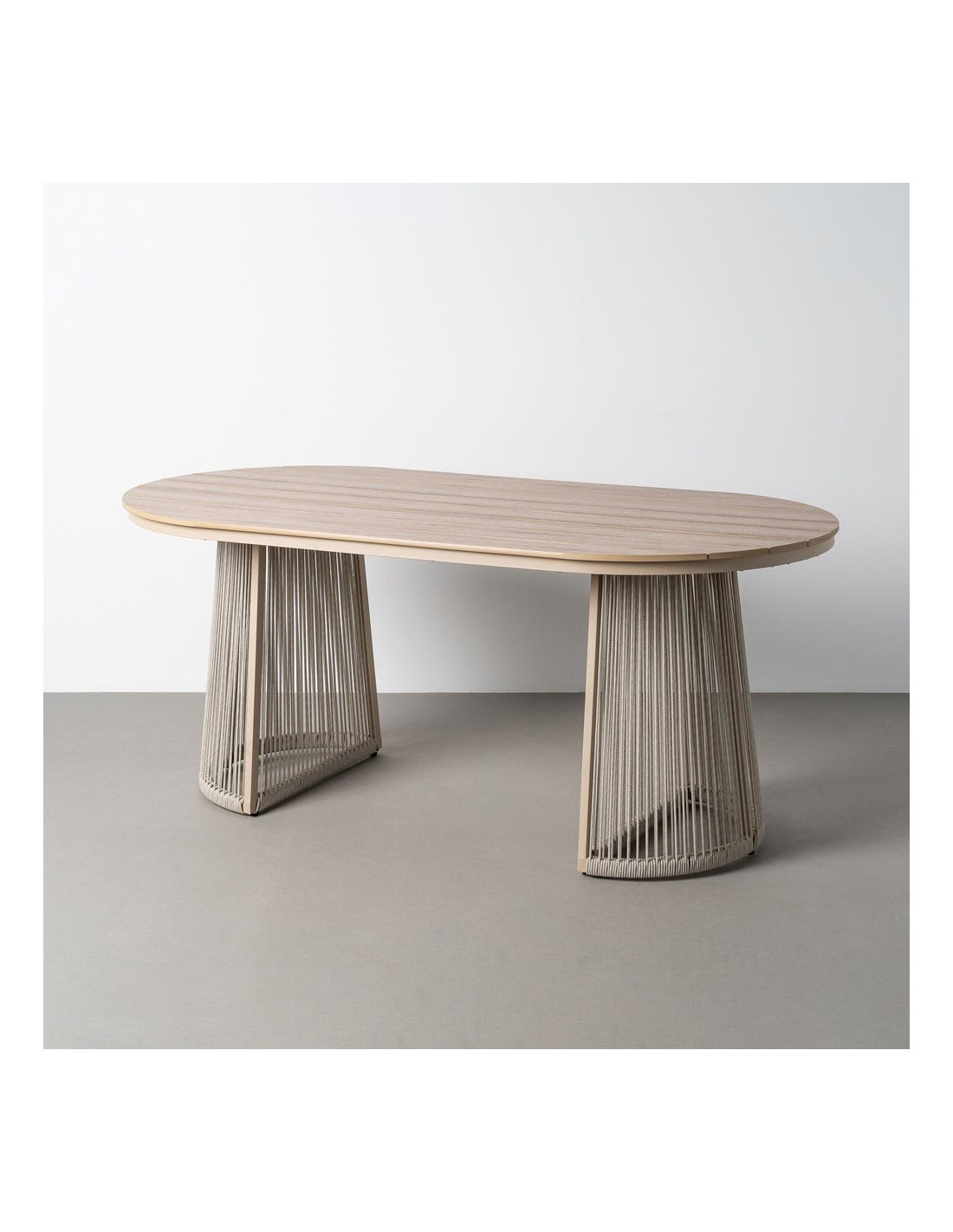 Une table de jardin pensée pour recevoir sans alourdir l’espace. Le modèle Thaléa associe un plateau effet bois clair à des pieds en rotin tressé pour un rendu naturel et structurant.