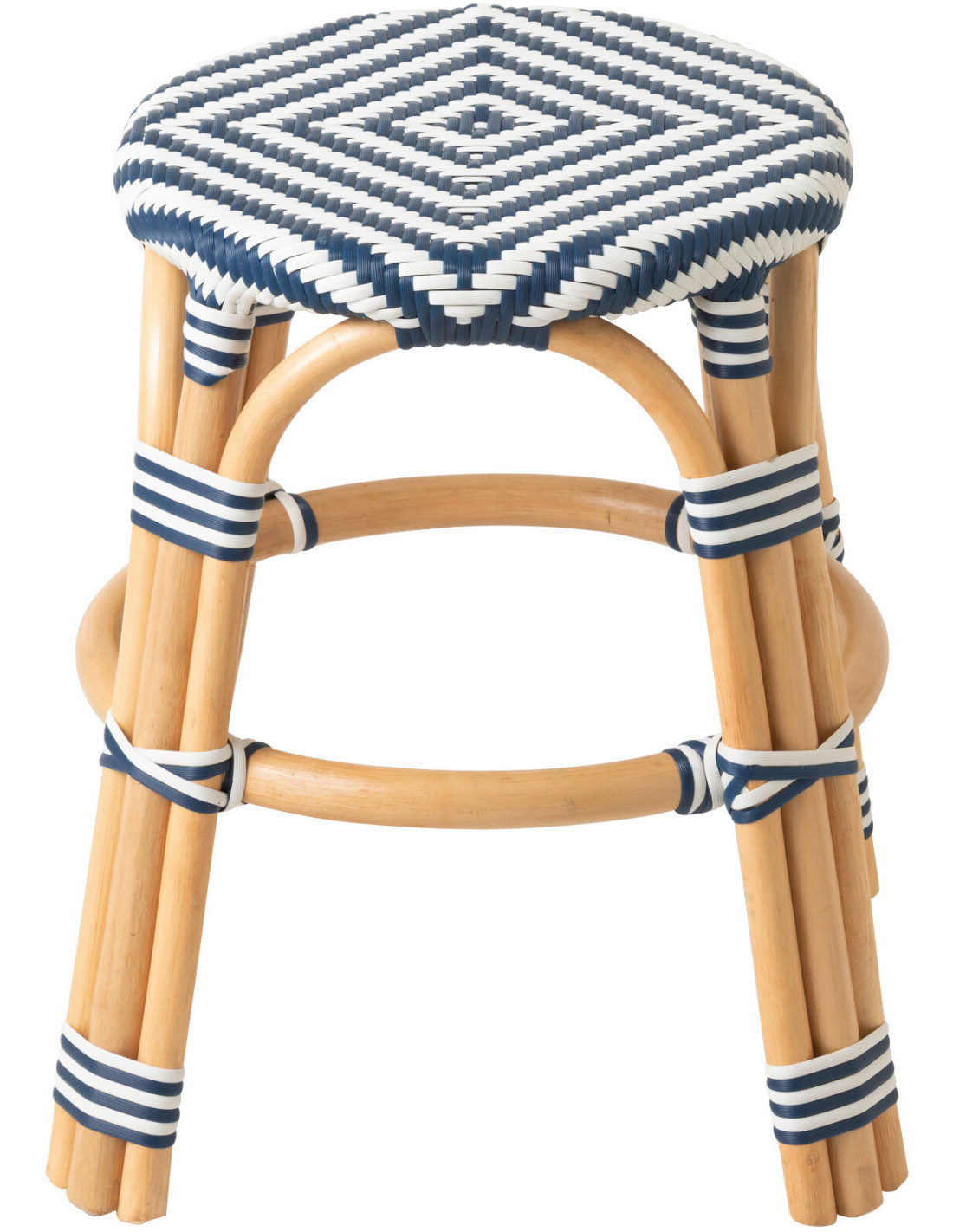 Tabouret de jardin Bistrot bohème Rond H 46 cm Rotin Naturel Plastique Bleu foncé Blanc Geo