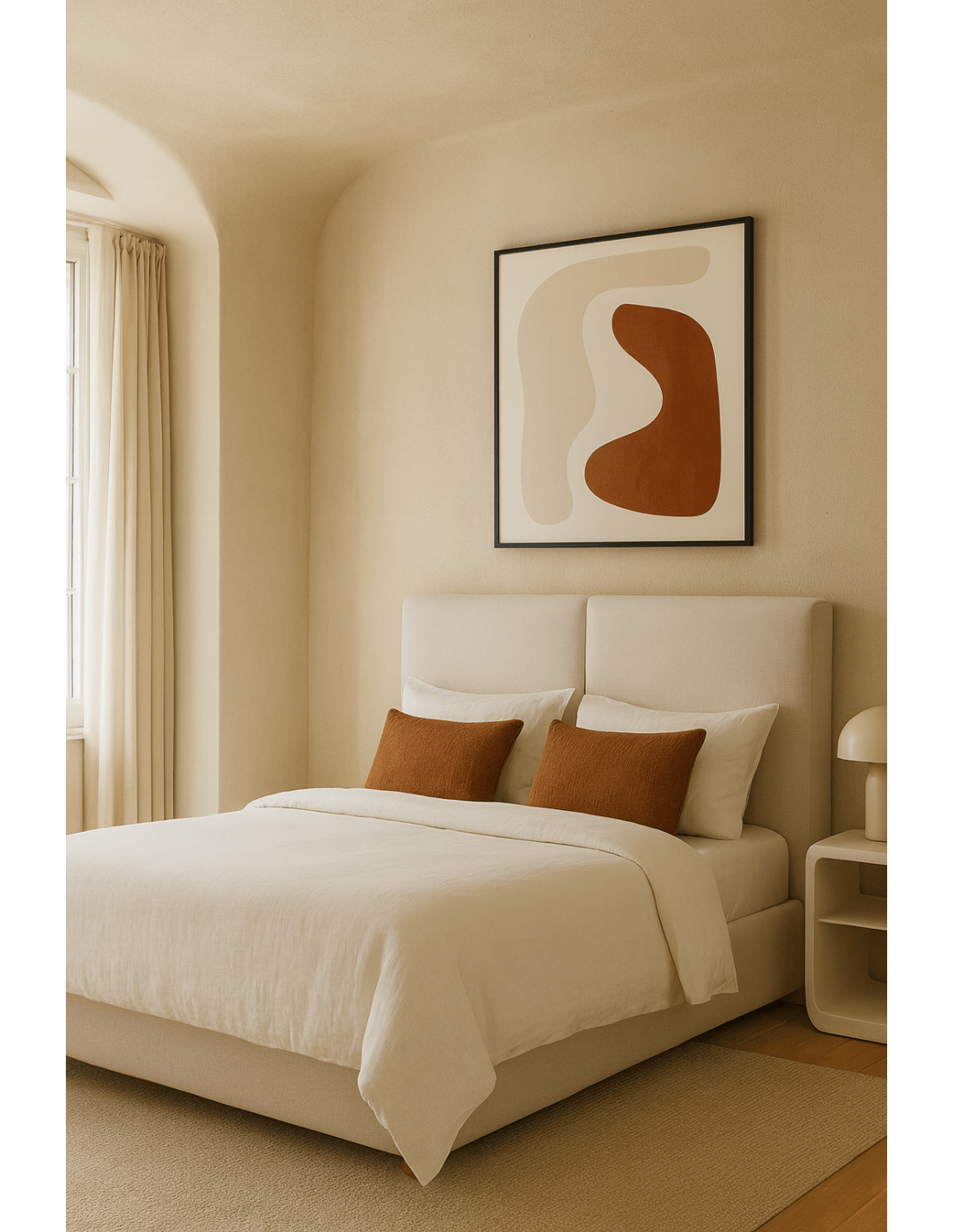 La surface textile capte la lumière et adoucit le mur. Le chant bois visible met en valeur la matière et équilibre la palette. L’ensemble crée un fond visuel calme pour les lectures du soir et les réveils lents. La teinte beige dialogue avec le blanc cassé, le lin, le noir mat et le laiton.