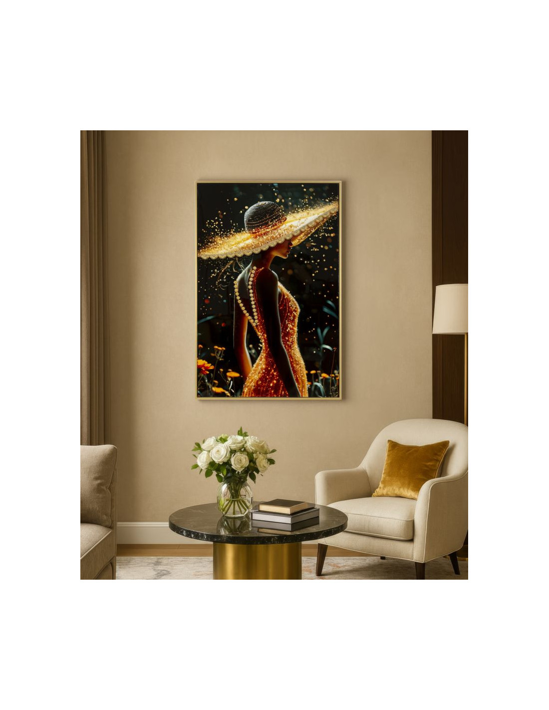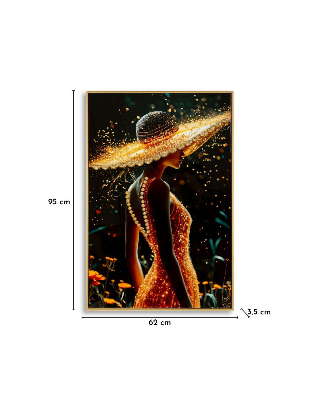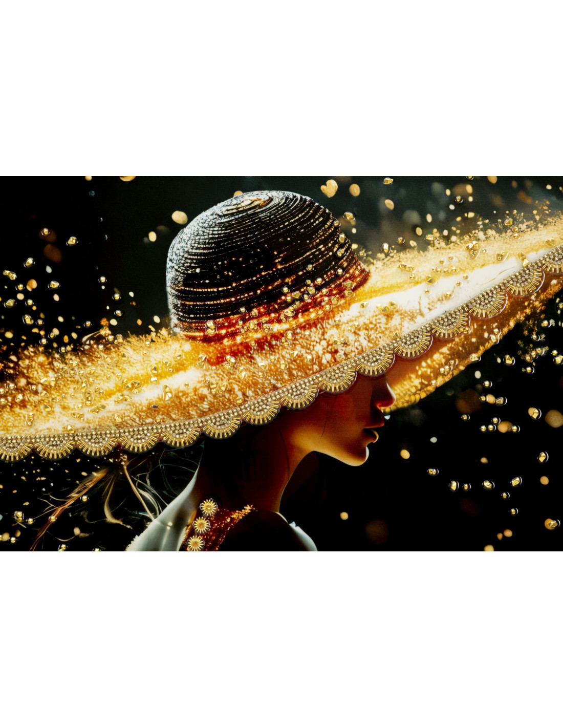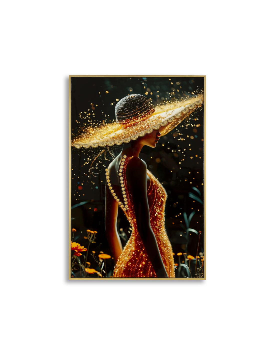 Toile murale Femme glamour avec strass Cadre doré 62x92 Finition laquée Illumy A