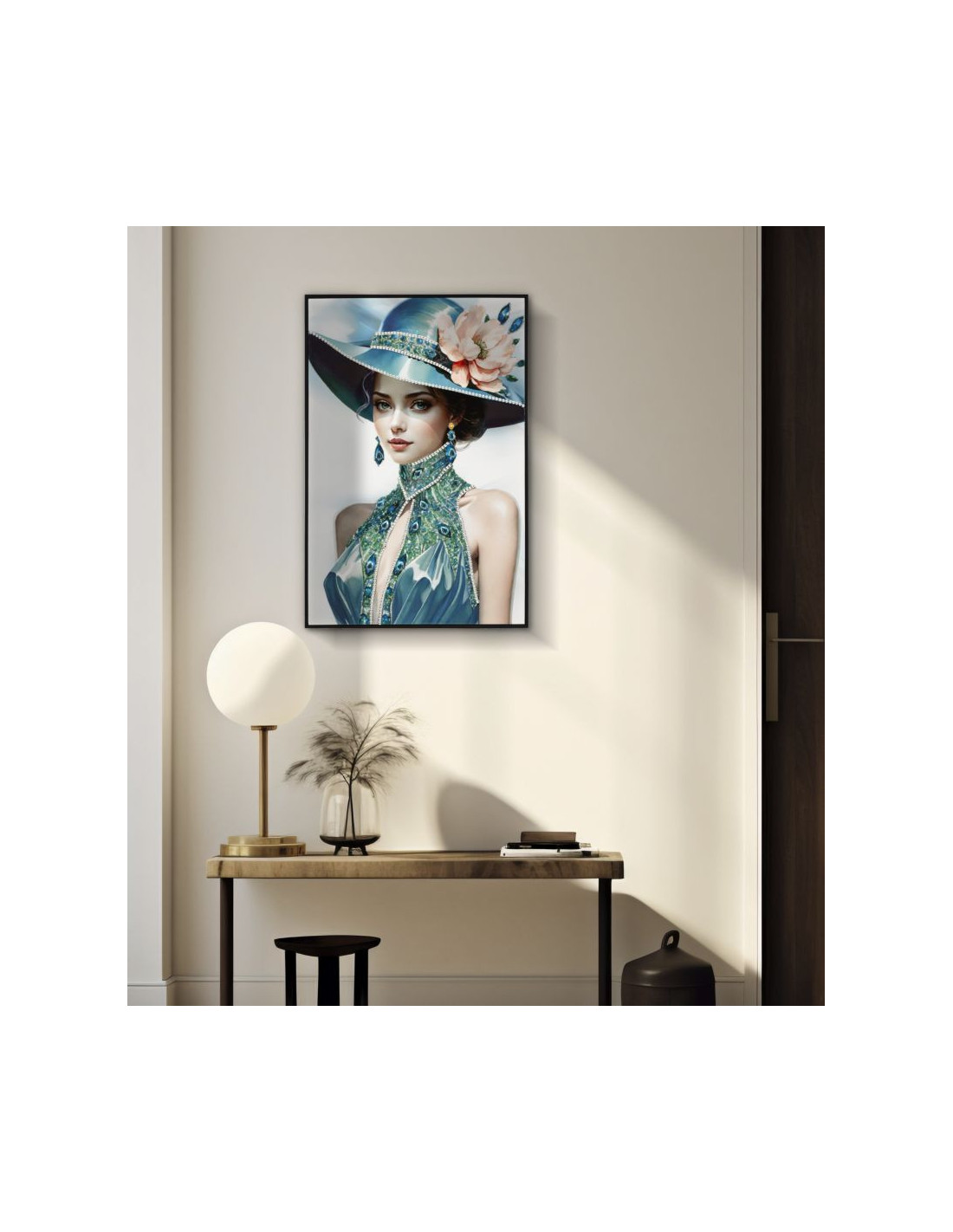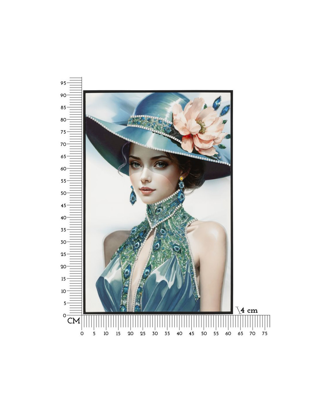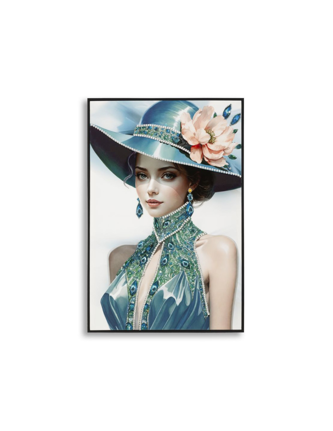 Toile murale peinte Femme chapeau bleu col bijou 62x92 avec cadre noir Pam